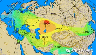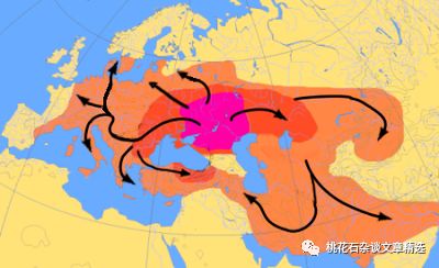 (古印欧人的迁徙假说,粉色区域为其发源地)