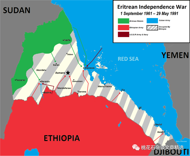(长达30年的厄立特里亚独立战争形势图,其中绿色区域为厄立特里亚独立运动的根据地,条纹区域为埃塞俄比亚政府军长期占据的地区)