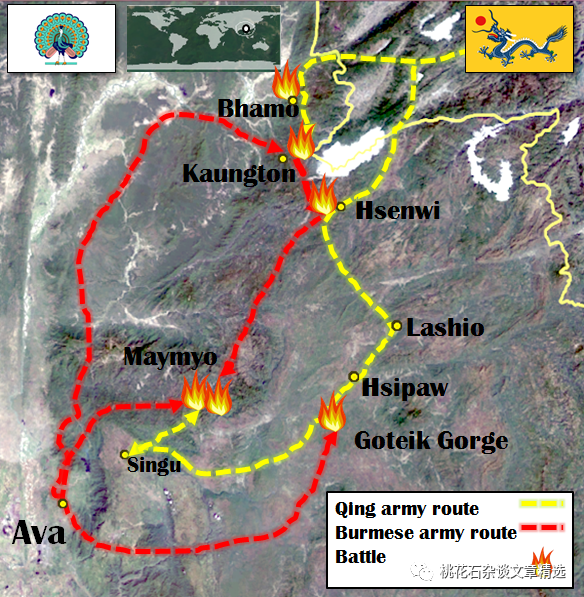 (清缅战争第三次战役形势图,黄线为清军进军路线,红线为缅军进军路线)