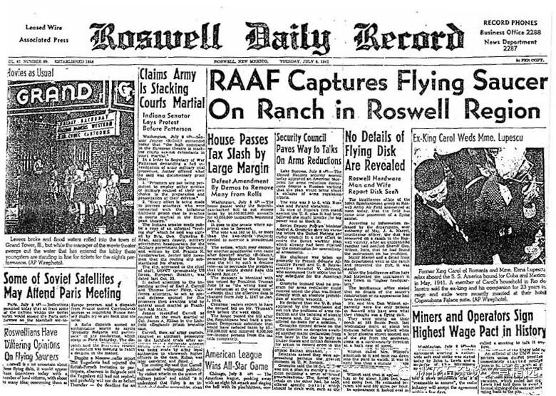 disc)一词在英语里其实也并不是特指跟外星人相关的飞行器,它的意思其实就是碟状的飞行物体,所以只凭这个声明,其实并不能说明当时有人承认发现了有外星文明痕迹的飞行器。然后第二天当地媒体《罗斯威尔每日记录报》就发布了一篇报道,其中说: