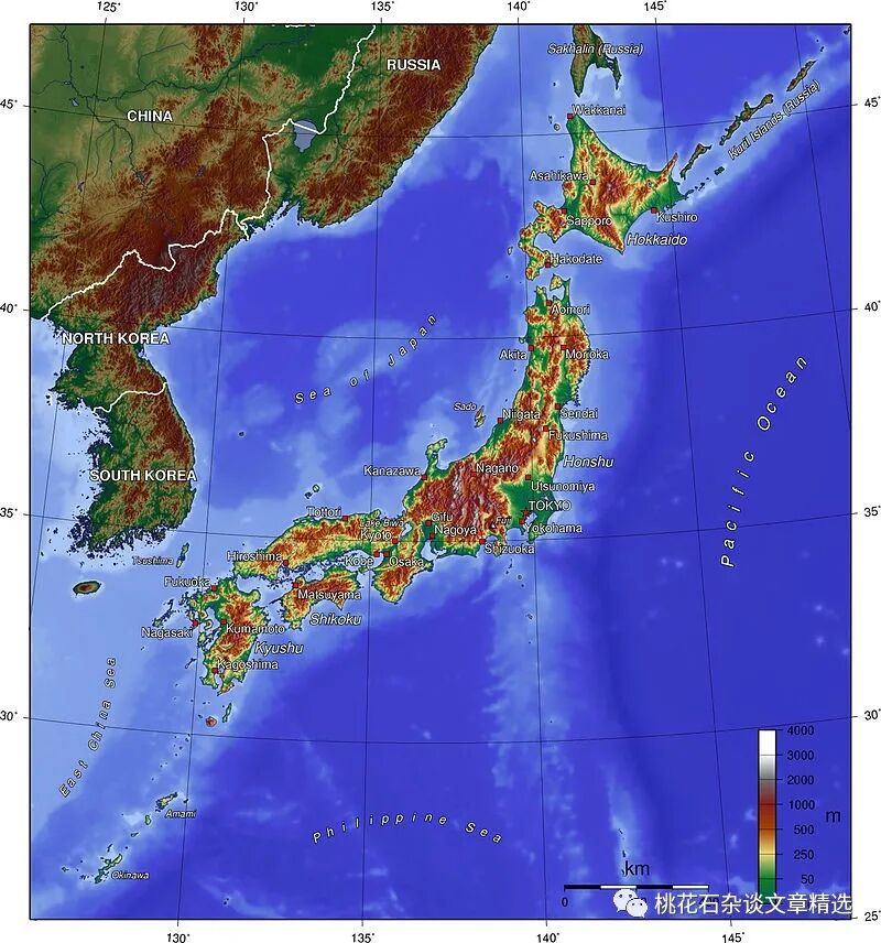 日本的地形图,从中可以看到日本的山地丘陵占有多大比例