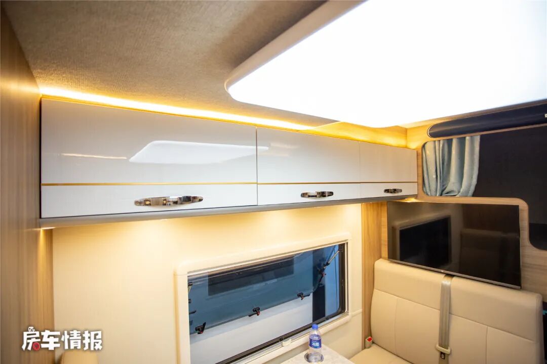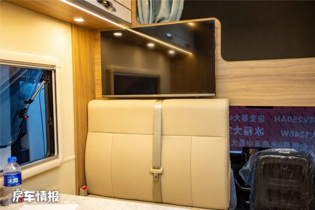 为了保证驾驶室的完整性,额头床板并没有设计可掀起的电视墙,而是在床位外侧设置一台固定的电视,尺寸适中,日常使用没有问题。
