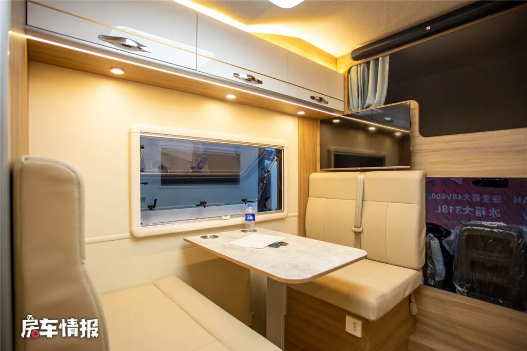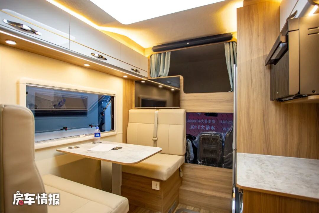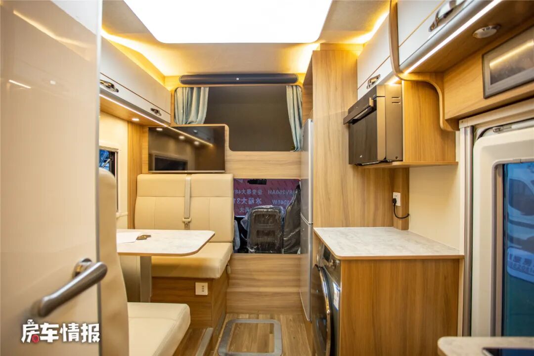由于这款车采用的是一个中部开门的方式,比起常见的前置或后置侧门,对于内部布局上会有些不一样。进入车内可以看到车内空间还是比较充裕的,并且车内所有家具、电器的尺寸也要比常见车型大了不少。