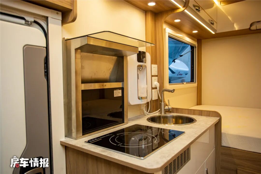 来到车厢中后部,位于车门旁是车内的厨房区域,提供了一台抽油烟机、电磁炉、洗菜池等,同样能够满足日常使用。