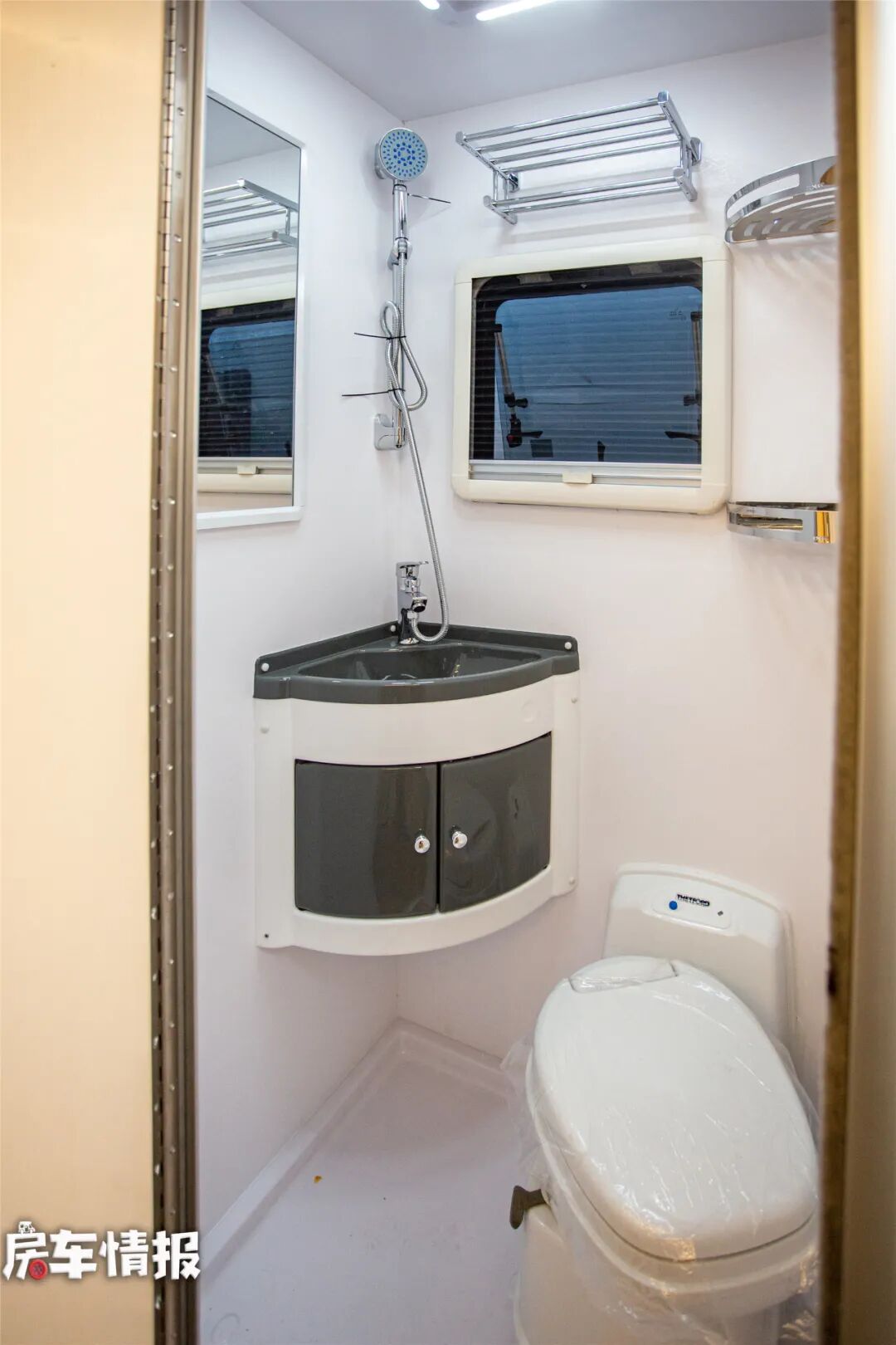 另一侧则是车内的卫生间,空间挺大,成年人在里边也可以轻松活动,内部提供了马桶、淋浴、梳妆镜等设施。