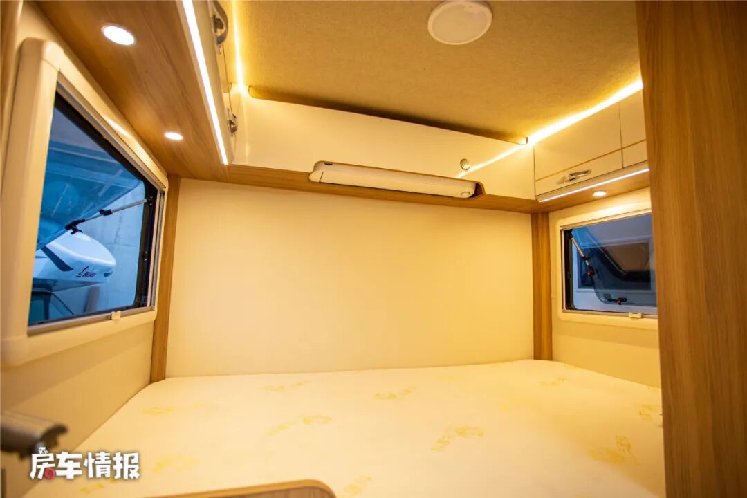 咱们从前往后一一介绍。驾驶室顶部是一张大尺寸双人床,能够轻松满足2名成年人休息,遗憾的是这里没有设计窗户,会显得略微有些憋屈。