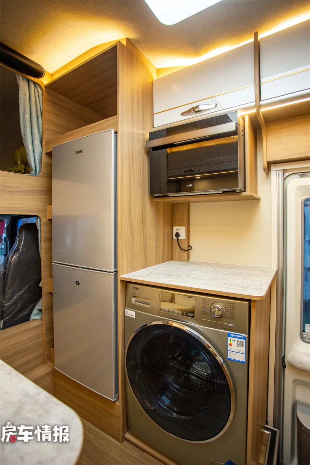 车厢另一侧则是提供了一些电器,有一台容积高达318L的双开门冰箱、蒸烤箱、洗衣机等,整体看起来十分接近普通家里的摆设。