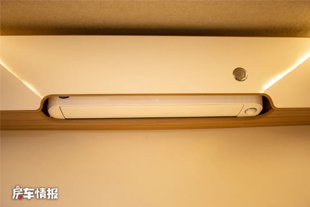车厢尾部是车内的另一个休息区,一张横置双人床,尺寸同样不小,能够满足2名成年人休息,位于床的顶部还提供了一台空调,对于改善车内温度有着很好的帮助。