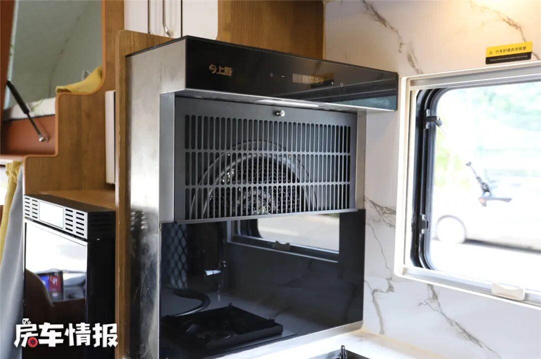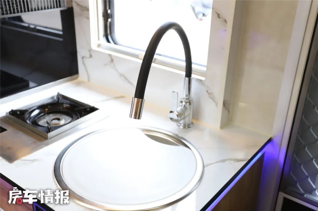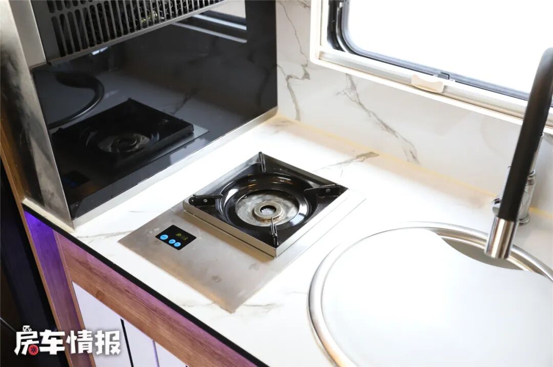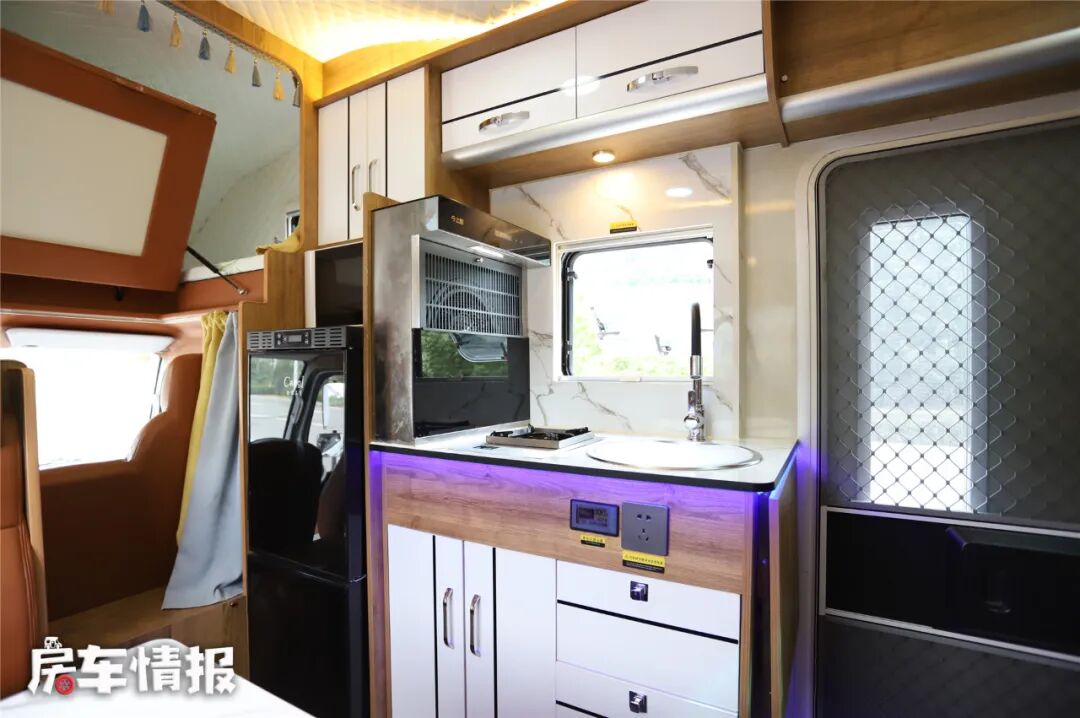 厨房区位于乘客门的前方,最前边是家电一体的区域,包括了一台微波炉和一台133升的双开门冰箱,能够满足日常分类存放食材的需求,后方则是主要的操作台,侧面还有可拓展的备菜桌版,台面上提供了洗手台盆,图片中的为车友定制车型,所以提供了一台柴油灶和抽油烟机,后期也可以按需去选装自己需要的配置。