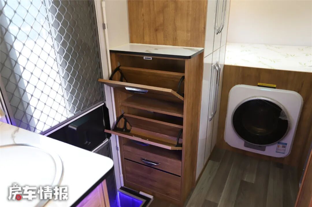 一进门的地方其实是打造成了一个小的玄关,带有一个多层设计的鞋柜,可以放置一些常换的鞋子,方便拿取,后方是则是全车内部主要的储物空间,尺寸还是很可观的。