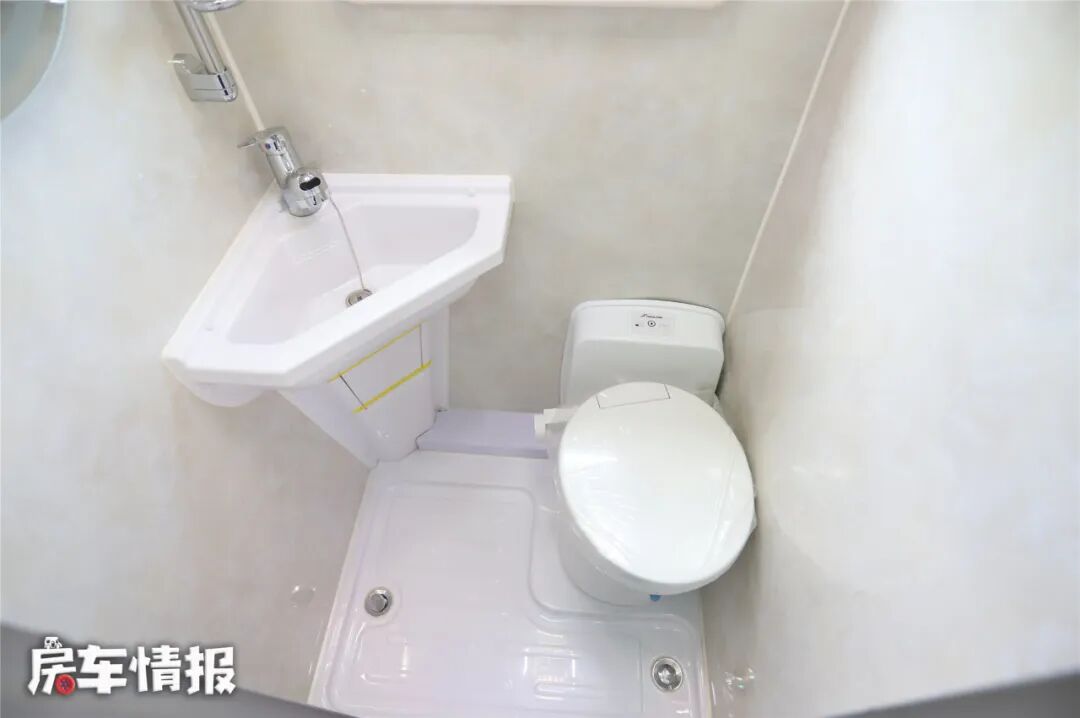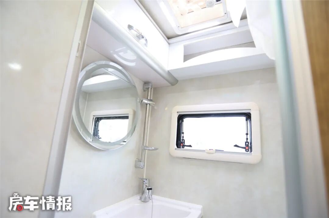 与之相对的则是全车的独立卫浴室,内部提供了可旋转的抽拉式马桶、抽拉的淋浴喷头、洗手台盆、智能化妆镜等,能够解决日常生活中一家人的洗漱和如厕需求。
