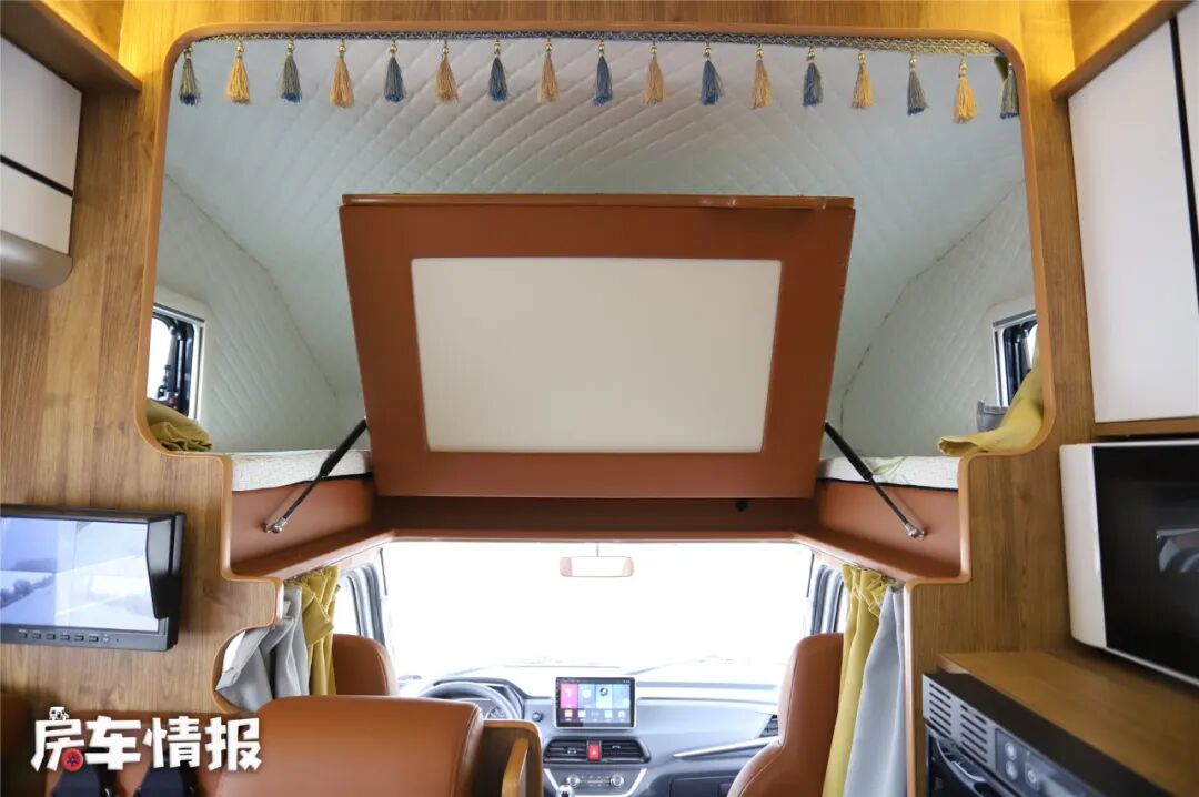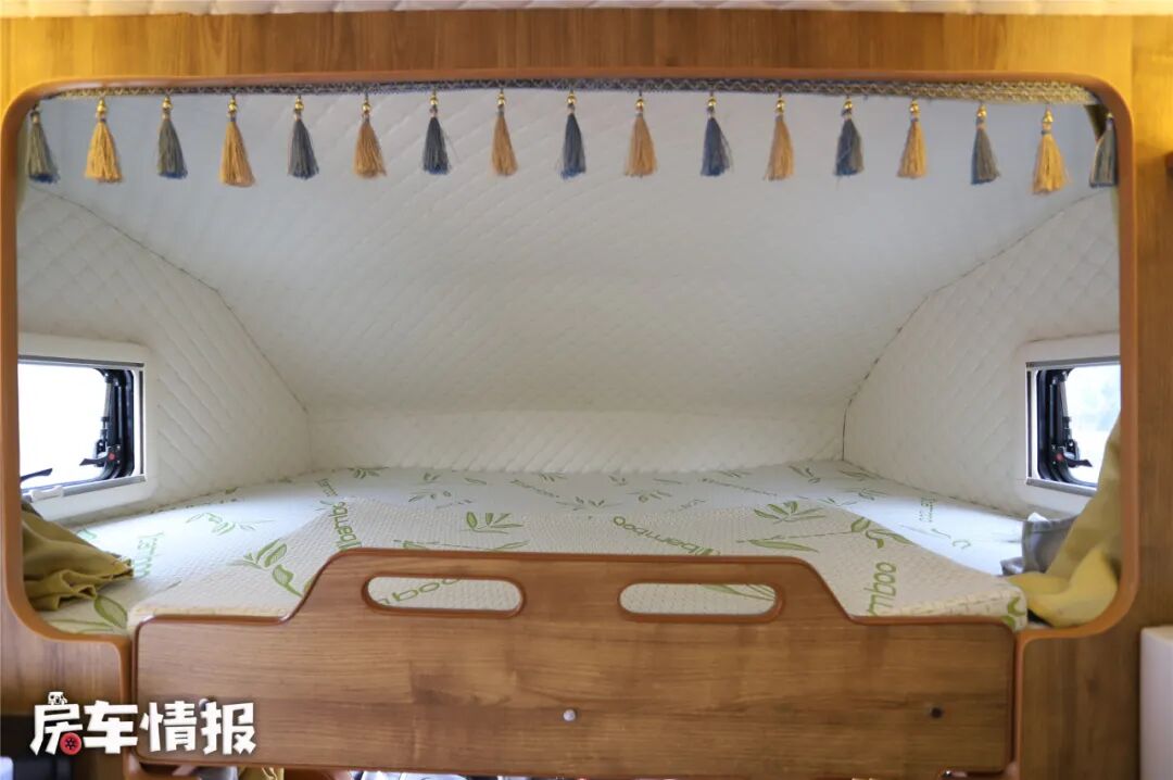 最前方驾驶室顶部是额头区域,内含一张额头床,得益于外观造型,额头区域的空间还是比较宽敞的,两侧带有通风采光的外推窗,床铺的尺寸为2000*1500毫米,完全可以容纳两个成年人使用。