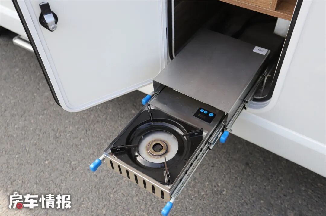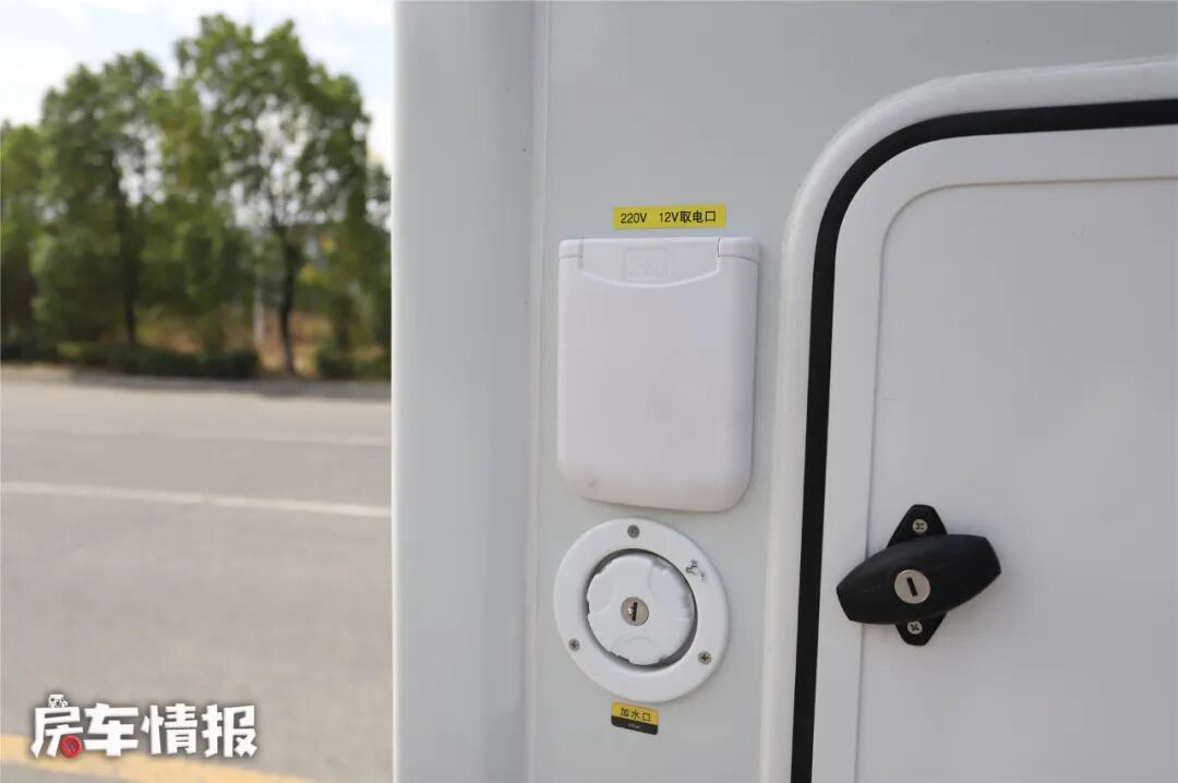 车厢采用玻璃钢一体成型设计,并且也提供了比较丰富的户外设施,包括遮阳棚、外置抽拉燃气灶(后期有需求还可以选择柴油灶)、车尾储物舱、水电接驳口等,能够满足基础的生活需求。