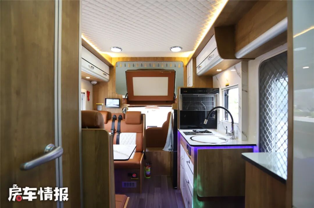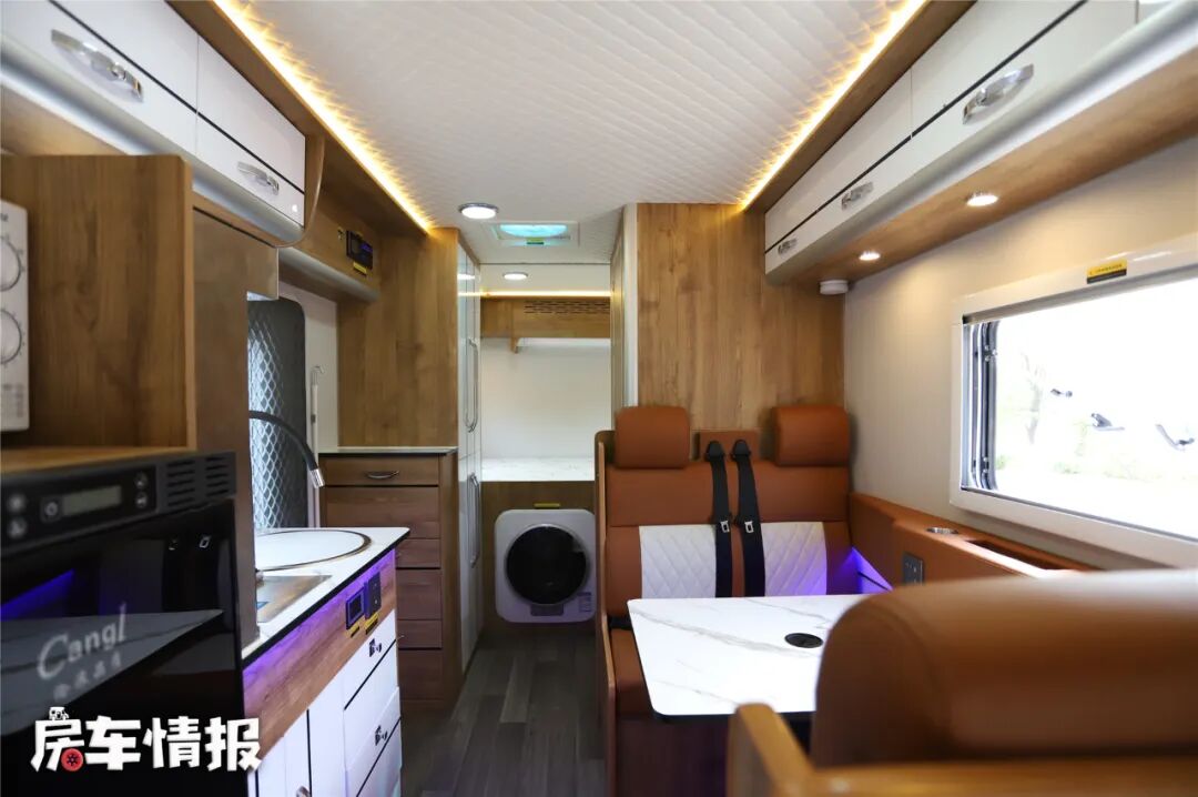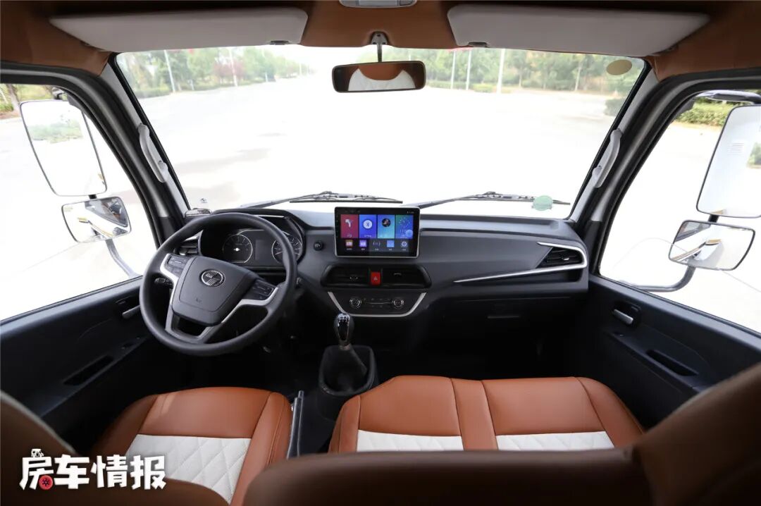 驾驶室内部的座椅都采用了皮质软包的设计,可以提供更好的乘坐感受,在动力方面,这款车是搭载了一台2.3T的柴油发动机,匹配自动挡的变速箱,后期还可以选装智能电子自动离合器,所以长期开惯了自动挡的朋友们也不用担心了,另外为了和后方的生活区配色更加的融合统一,前方的驾驶室座椅还有天花板都采用了同样的配色,视觉感上也非常的舒适。