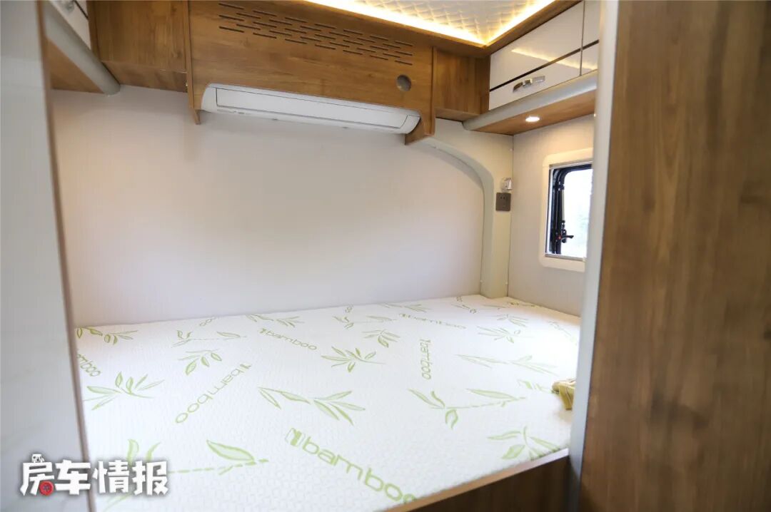 车尾部就是全车的睡卧区了,采用了横置双人床的设计,床铺的尺寸可以达到2000*1200毫米,顶部还有一台家用变频空调,以及储物吊柜,可以满足日常所需,另外两侧还有通风采光的外推窗,所以整个车尾部还是很通透的。