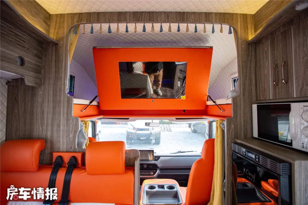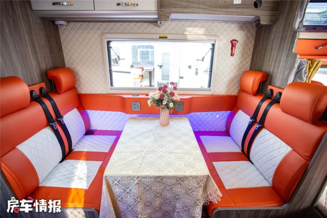 生活区采用原木色家具,整体偏田园风格。会客区采用四人对卡位沙发,依旧是与主副驾座椅保持一致的爱马仕橙配色,每个作为都配备有安全带,行车时也可以坐在这里。墙面采用软包处理,顶部还有储物吊柜和变频空调,会客区的温度可以得到保障。