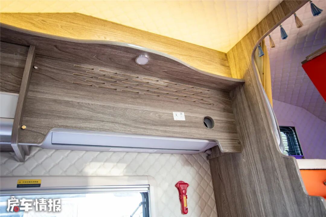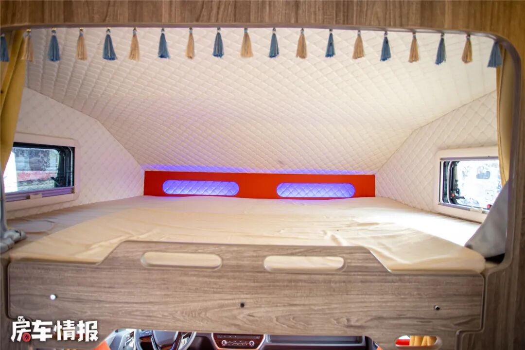 驾驶室上方是一张1.5*2.2米的额头床,得益于平头轻卡的造型,额头床无论是面积还是内高都比较优秀,休息时还可以打开头顶的氛围灯带和两侧的外推窗来调节一个舒适的睡眠环境。额头床在不使用的时候就可向上反转出电视来欣赏节目打发时间。