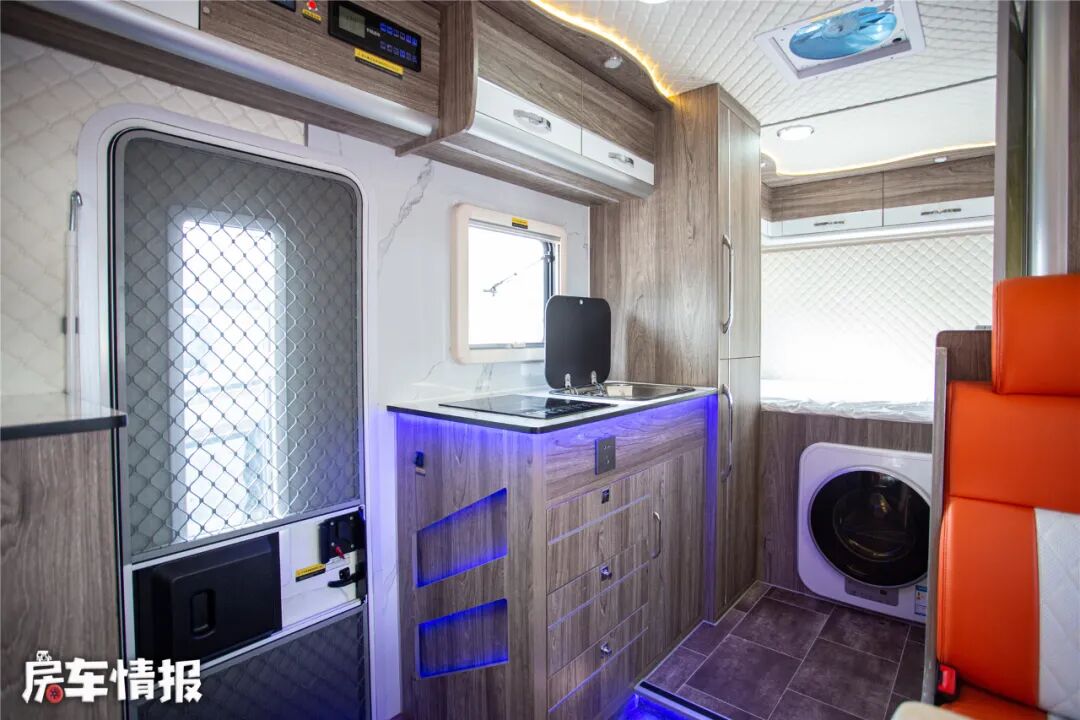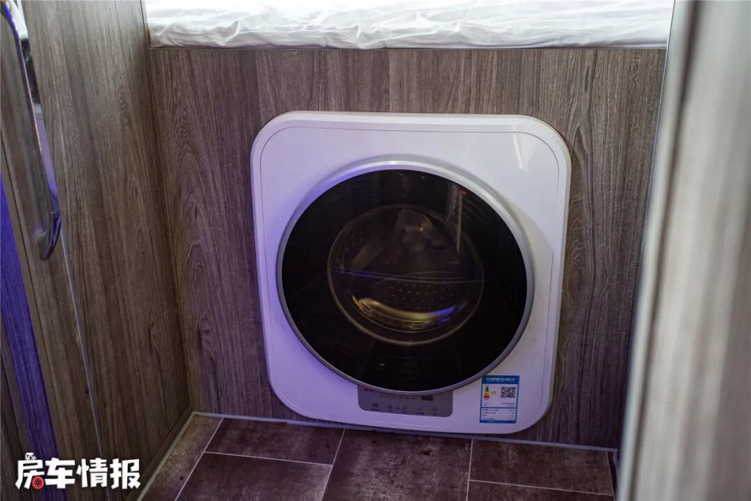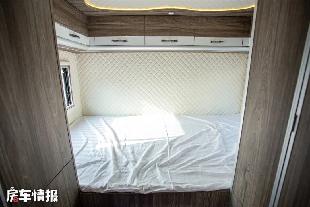 车尾部是一张1.2*2.2的横置床,在上方还有一圈组合吊柜,两侧有外推窗,为优质睡眠提供了保障。在床下是3公斤的洗衣机,可以解放双手,空出更多时间做其他事情。