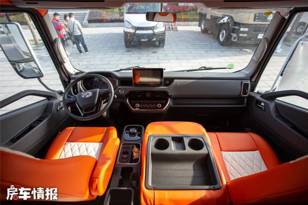 超过3米的高度就比较考验上下车的身体灵活性了,好在主副驾的上下车台阶设计得比较符合人体工学。坐进驾驶室能够发现座椅采用了很流行的爱马仕橙的配色,给人眼前一亮的感觉。并且中控台也不像传统卡车那样简陋,看起来摸起来质感都很不错,接近于家用车的标准,比较亮眼的还是旋钮档把,可做到与豪华汽车相媲美。