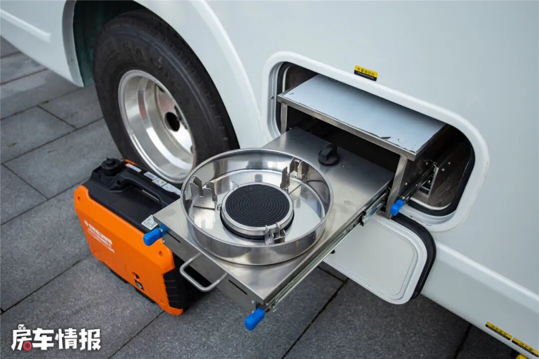 在车侧安装了遮阳棚,遮阳棚下方则是抽拉燃气灶,在室外炒菜可以有效避免油烟弄脏车内家具。后期还可根据需求改装成燃油灶,尾部的储物空间也可随车放置厨具。