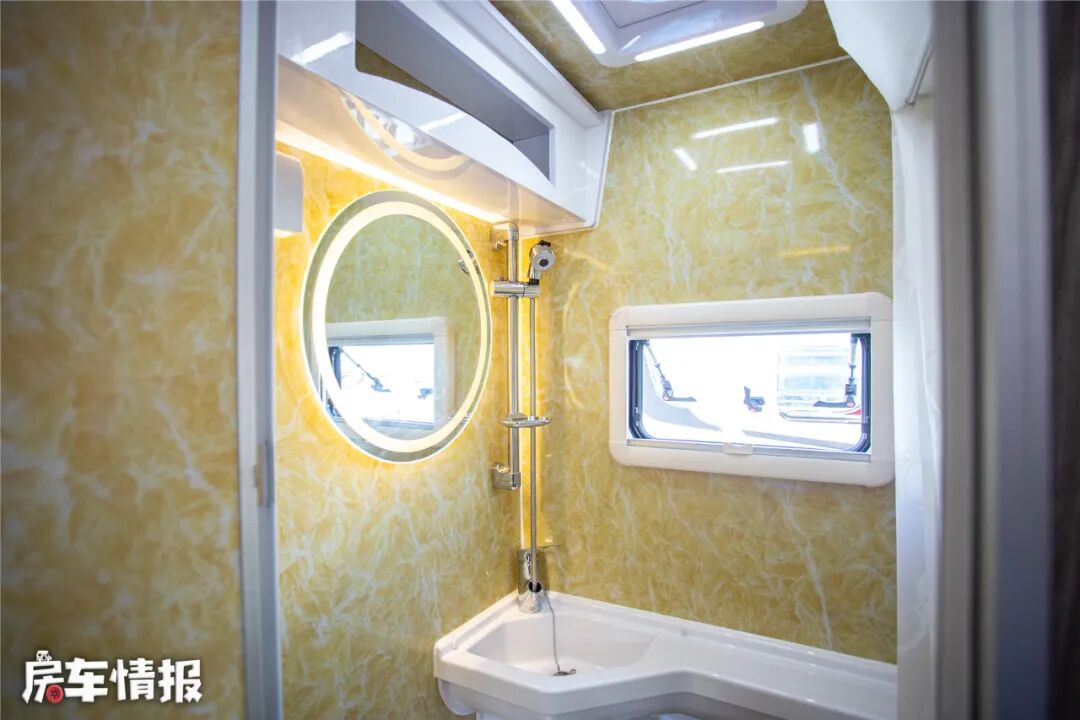 卫生间内部使用了仿大理石的黄色花纹,不像纯白的那样单调。配备有固定马桶、洗手池、补光镜等,日常洗漱时空间也不小,上方的双向换气扇和外推窗也便于交换新鲜空气。