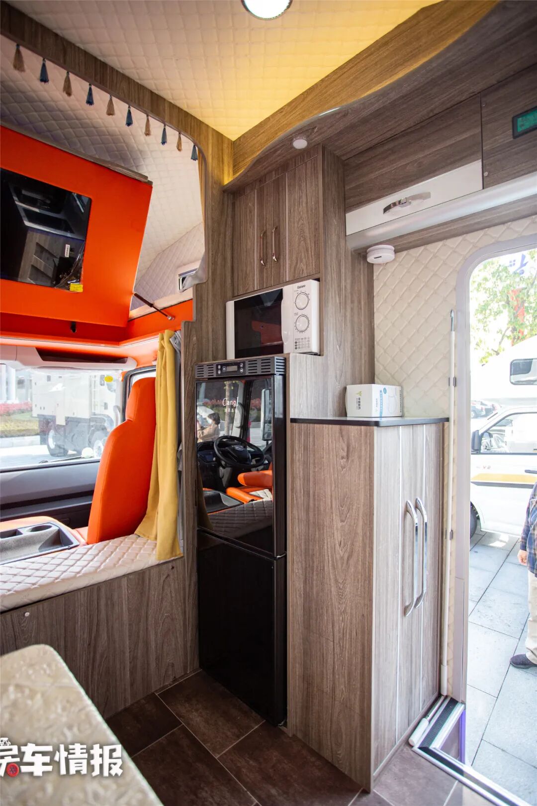 车辆中门一侧是微波炉和房车专用冰箱,在门口还有一个小吧台,柜子可以放置鞋子或是工具,空间还是很充足的。