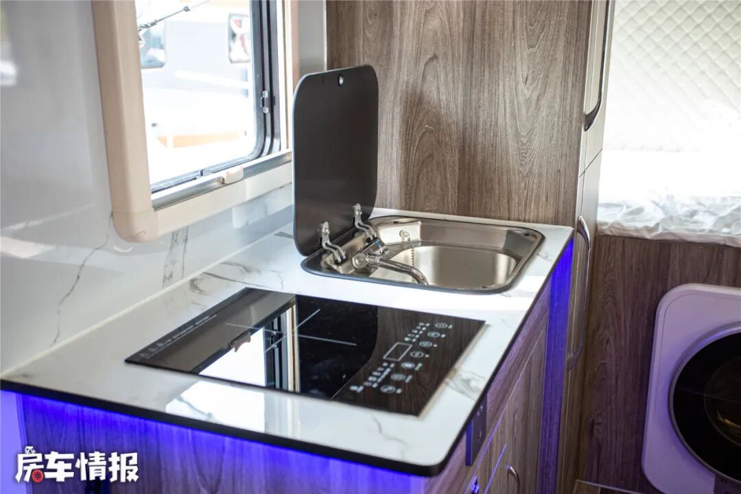车内厨房区的电磁炉看起来很高级,并且洗菜池和电磁炉都是平面设计,操作台使用起来空间还是不小的。在操作台下方还有储物格和储物抽屉便于放置各类物品。