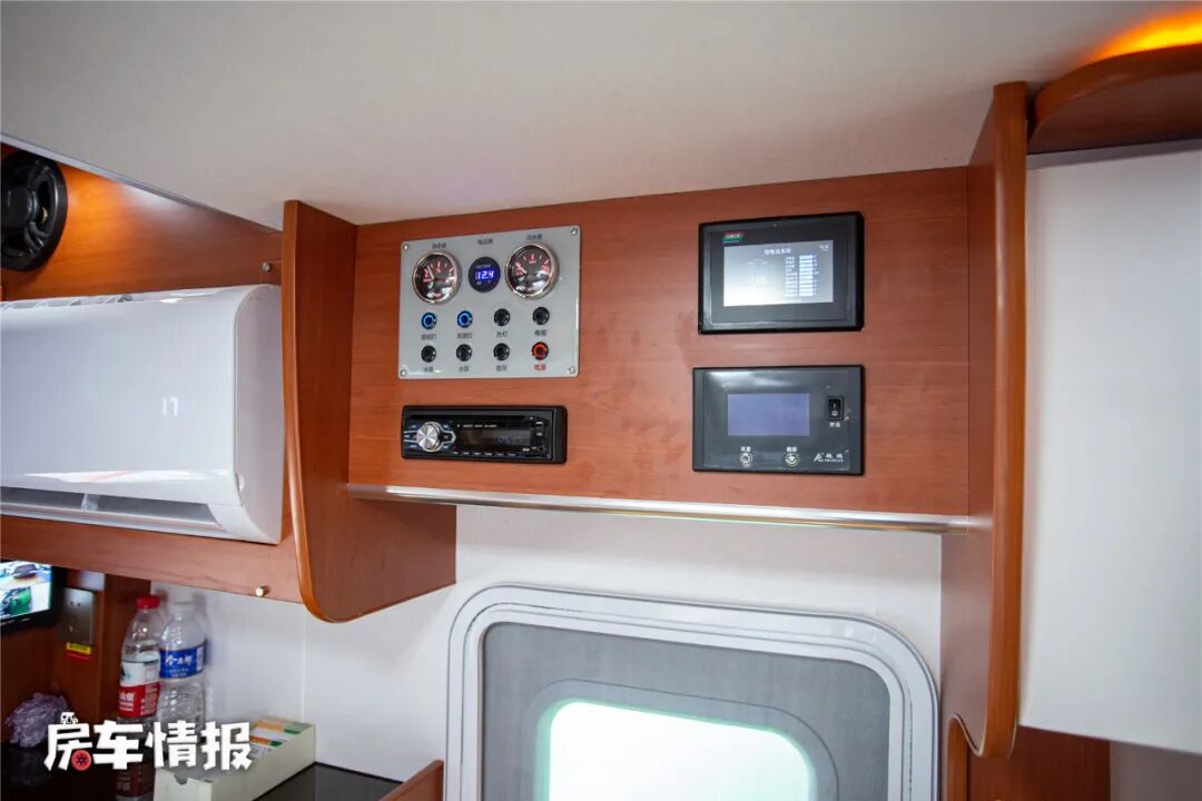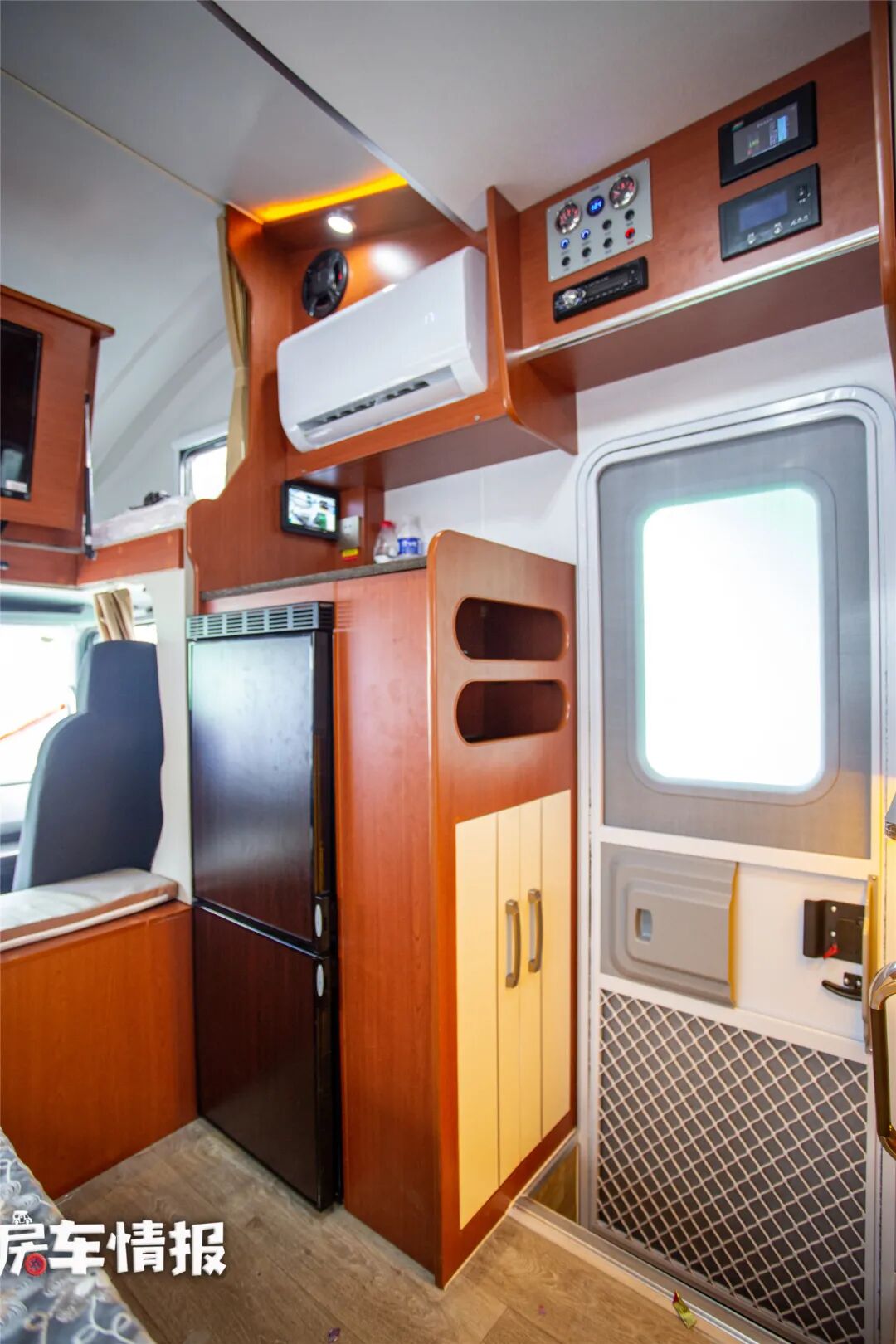 位于副驾驶座椅后方是一组柜子,这里提供了一台85L房车专用冰箱,柜子上方还预留了不少的存放物品的区域,位于柜子顶部是一台车载空调。