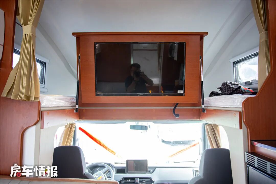 打开床板下方,同样是一台液晶电视,打开以后便于坐在卡坐沙发上观看电视节目,增加了房车生活的娱乐性。