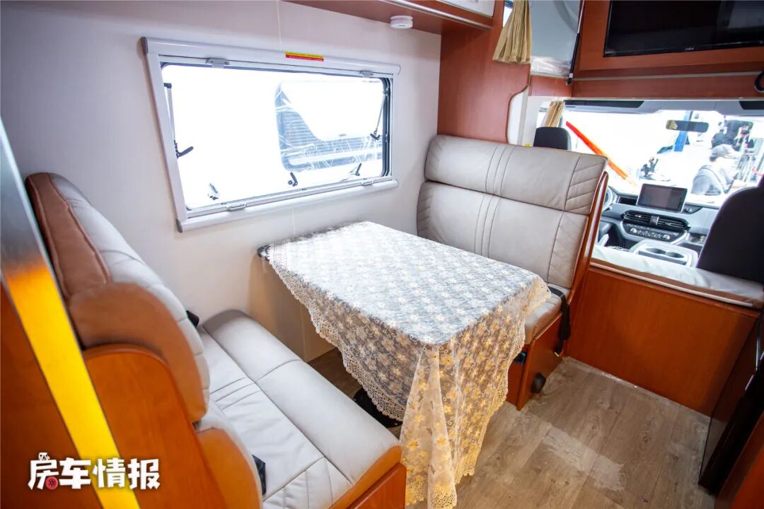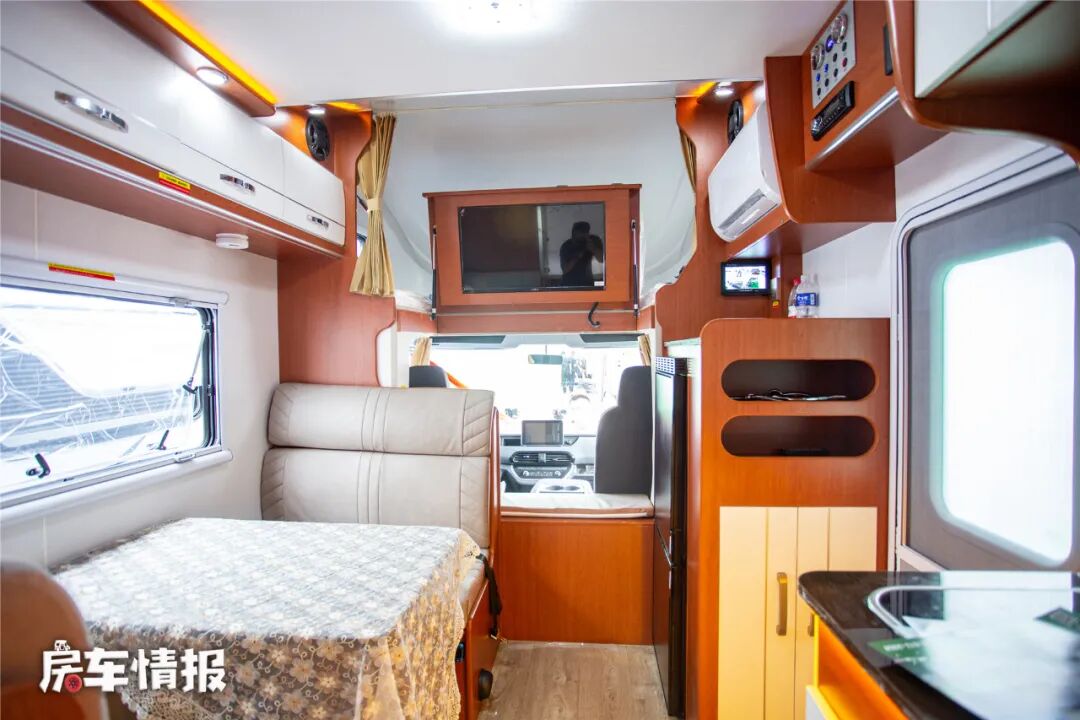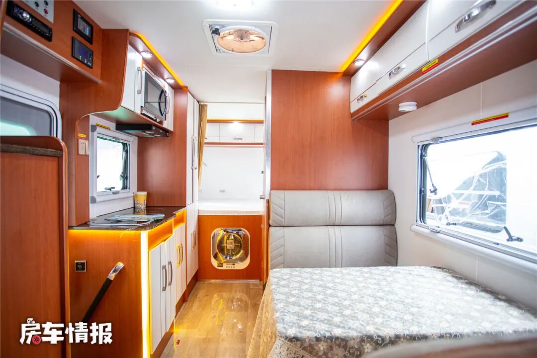 进入车厢内部,可以看到尽管车内没有使用拓展机构,但得益于轻卡房车较为方正的造型设计,车厢内部空间表现相当出色,比起依维柯C型房车,内部空间明显要更高、更长!