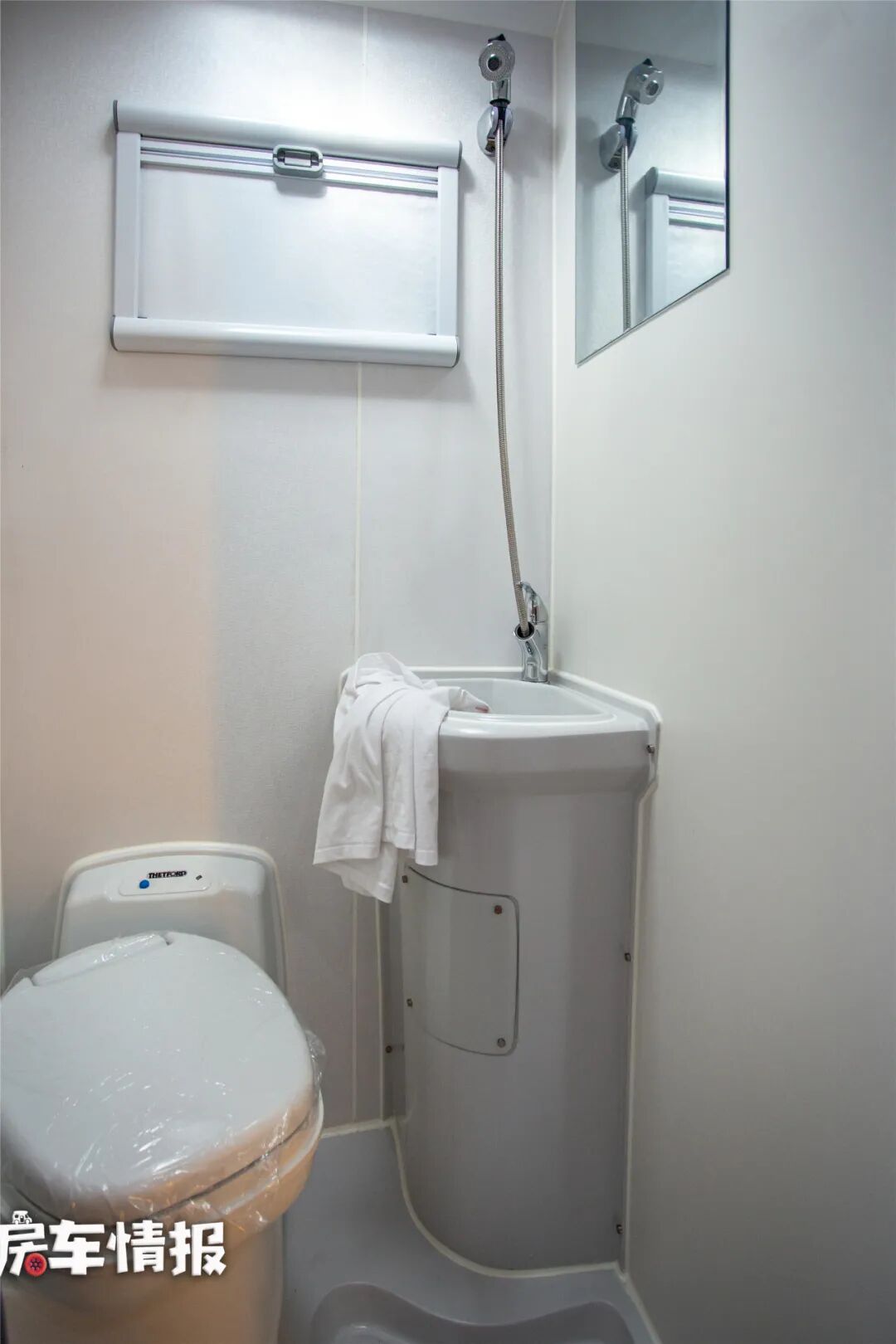 卫生间同样位于车厢中部,内部空间表现挺令人满意,不仅空间大,设备也很齐全,淋浴、盒式马桶、梳妆镜、换气扇等全都有,能够为日常提供了一个较为舒适的洗漱空间。