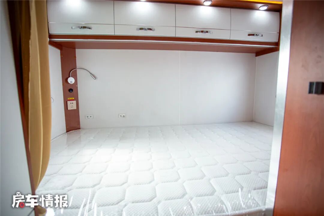 驾驶室顶部同样是一张尺寸超级大的额头床,反正的车身造型使得这里的空间表现相当优秀,床位内外侧的头部空间一视同仁,无论睡内侧还是睡外侧都可以获得相同的头部空间。