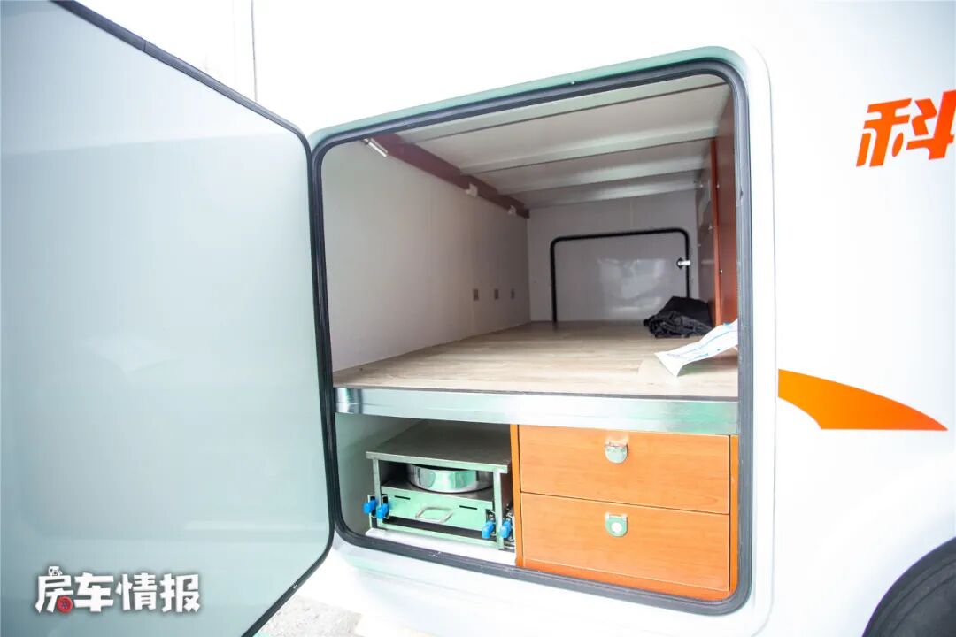 车身外部也提供了一些常用的房车设备,如车身顶部的手动遮阳棚、车尾部的外置抽拉燃气灶以及储物箱等,值得一提的是这款车尾部的行李箱空间非常之大,内部也很规整,经过我们实测,一名成年人也可以轻松爬过这个储物箱。