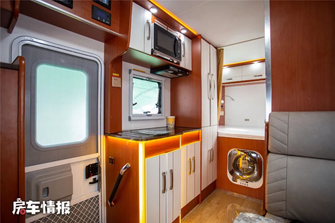 车内厨房区域位于车厢中部,这里提供了完整的厨房设备,微波炉、抽油烟机、电磁炉、洗菜池等一应俱全,当车外环境不允许的时候,在车内同样可以制作丰盛的食物。