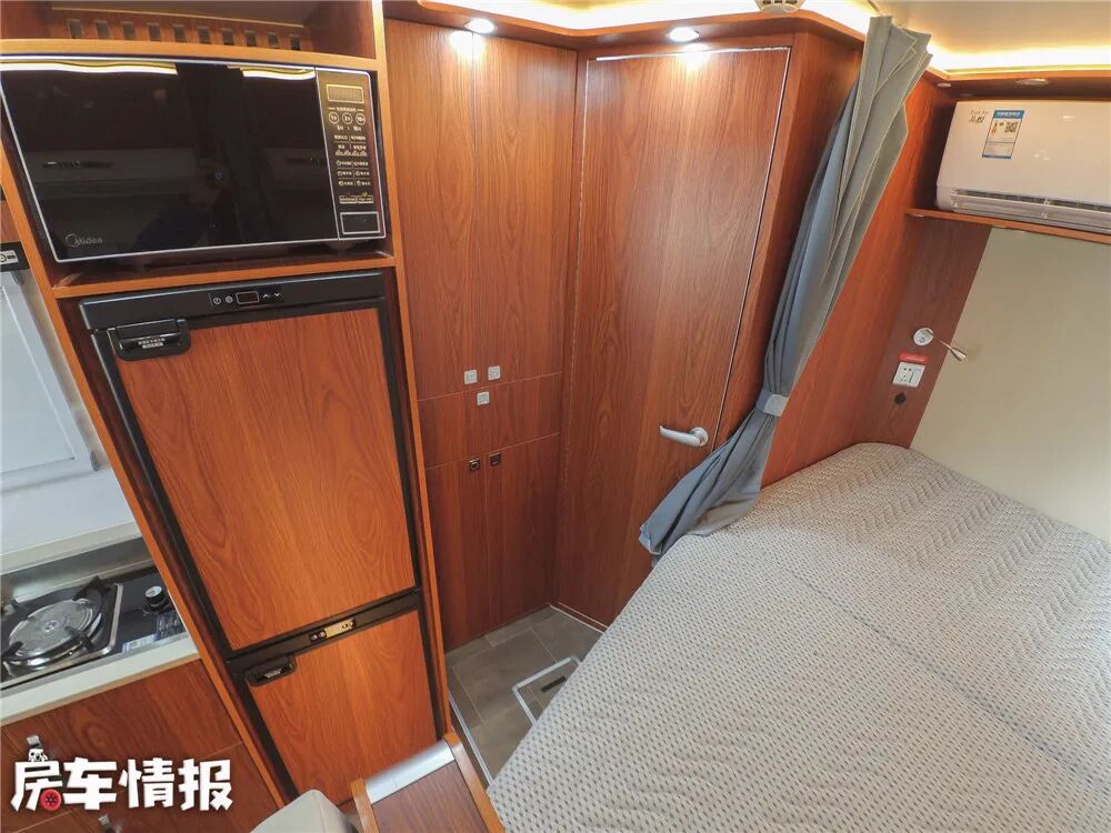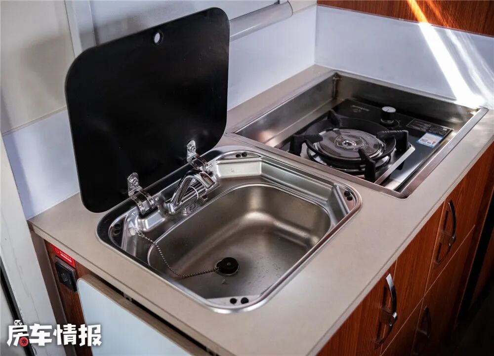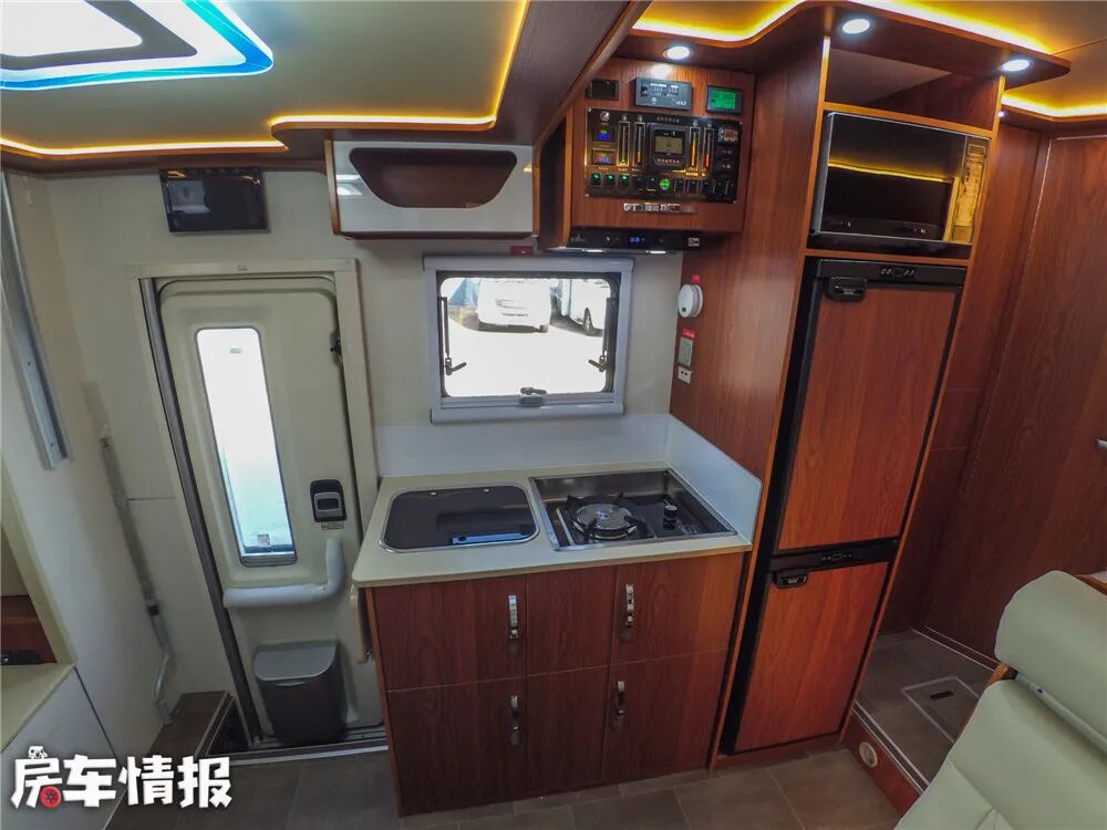 车厢另一侧是车内的厨房区域,车内的厨房区域的设备依然非常充裕,燃气灶、洗菜池、抽油烟机、150L房车专用冰箱、微波炉等等一应俱全,当车外环境不允许使用外置燃气灶的时候,依然可以在车内一展厨艺。