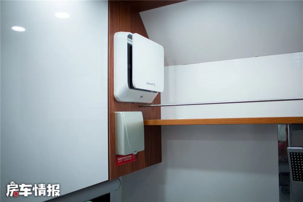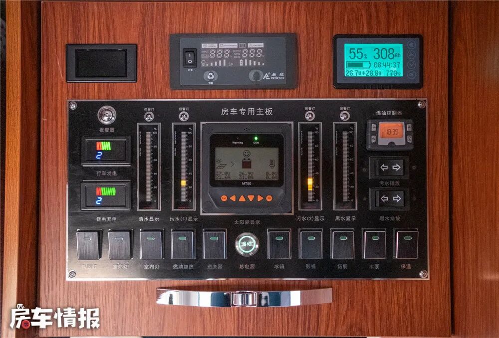 在水电方面,这款车也配备的十分充足,3000W逆变器、24V 400Ah锂电池(约合10度电)在加上1000W太阳能板,足够解决旅行中用电问题;200L净水箱和70L灰水箱也能够满足一家人的日常洗漱。取暖方面还提供了燃油热水暖风系统以及家用空调,对于日常使用来说完全没问题。