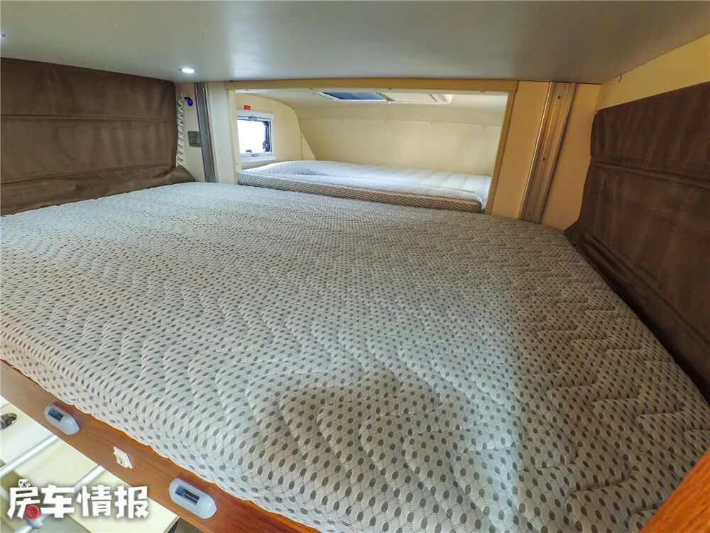 除了前面介绍过的沙发床、尾部纵置床以及额头床以外,这款车的顶部还提供了一张电动升降双人床,尺寸同样不小,可以满足2名成年人休息,如此这款车可以满足6-8人同时休息,这在6米以下的C型房车里挺少见的。不过,个人觉得4-6人的状态是最舒服的。