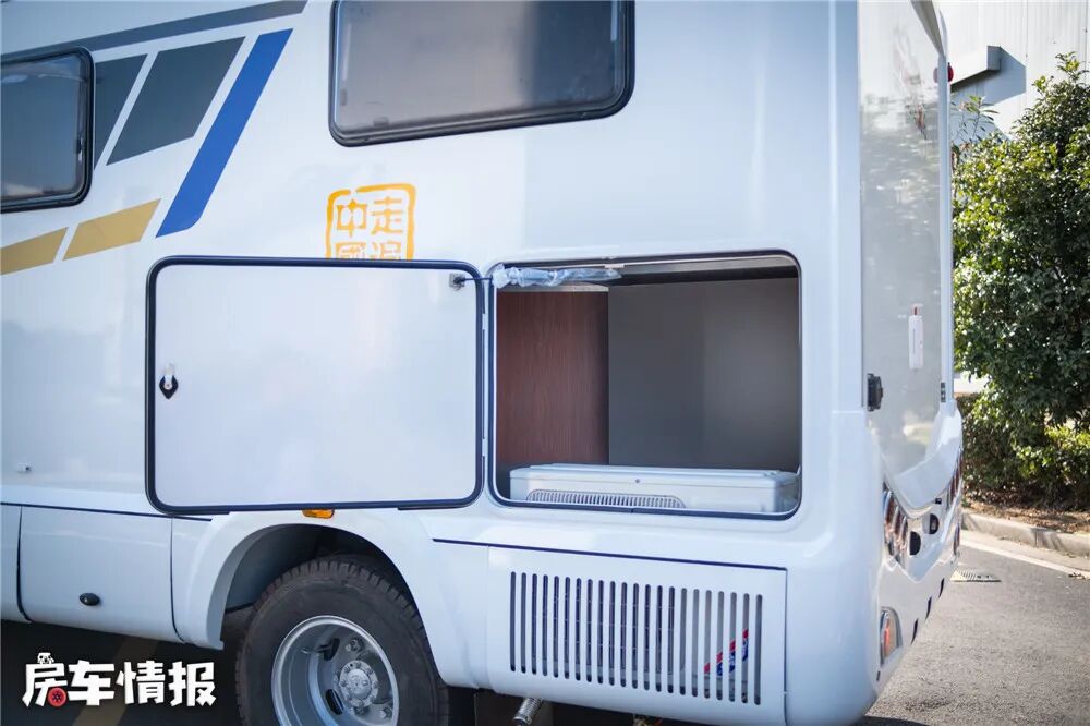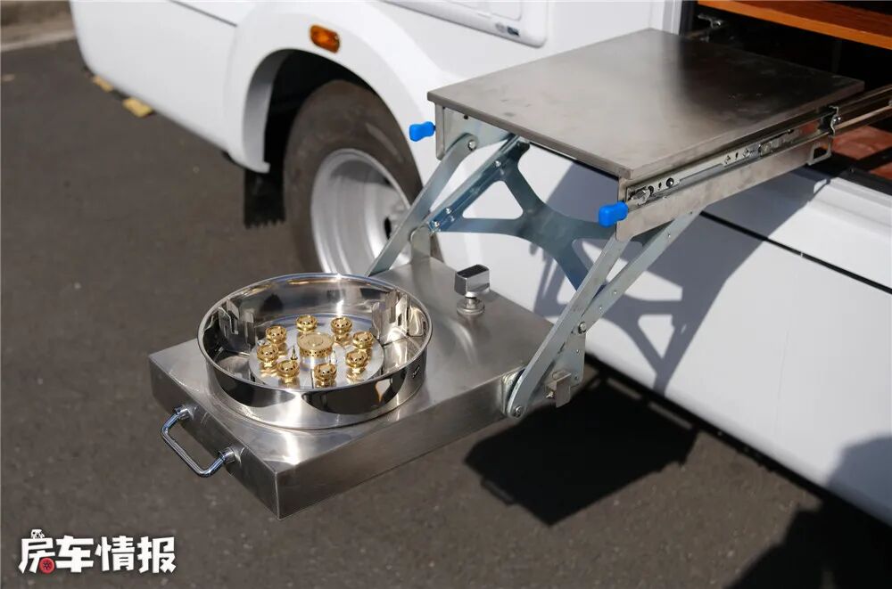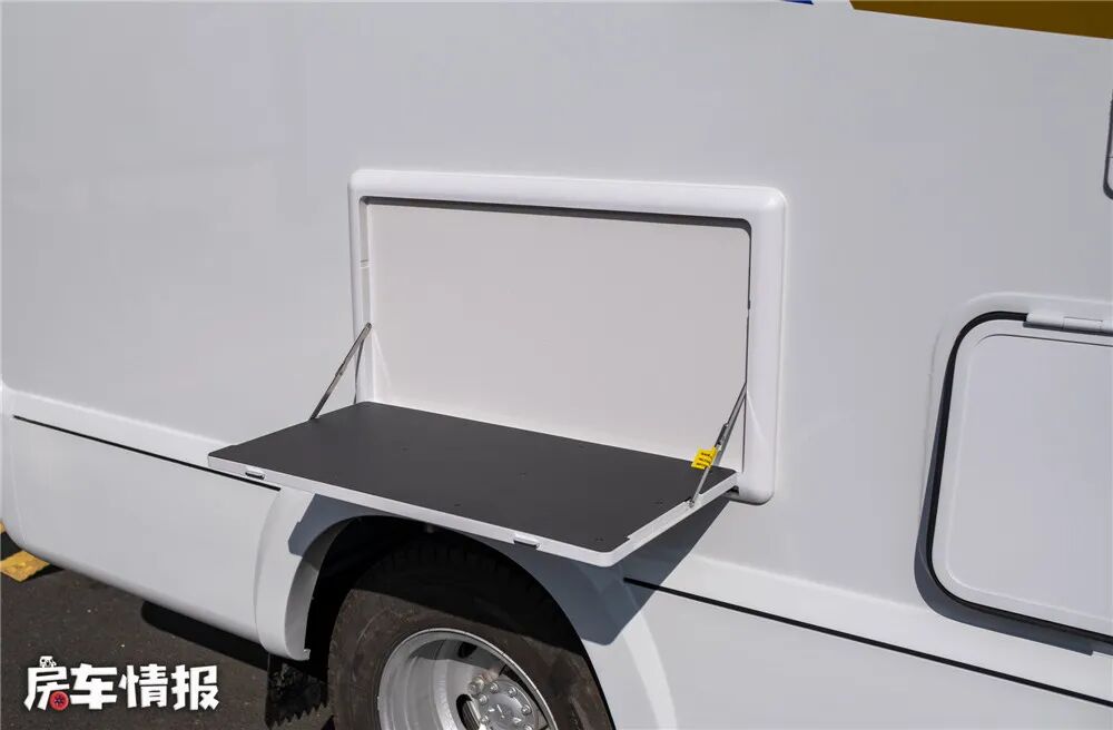 车身外部还加入了一些实用性设备,如遮阳棚、置物翻板、抽拉燃气灶、储物箱等,提升了日常使用的便利性。