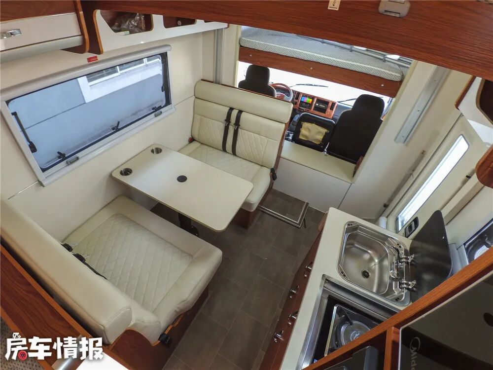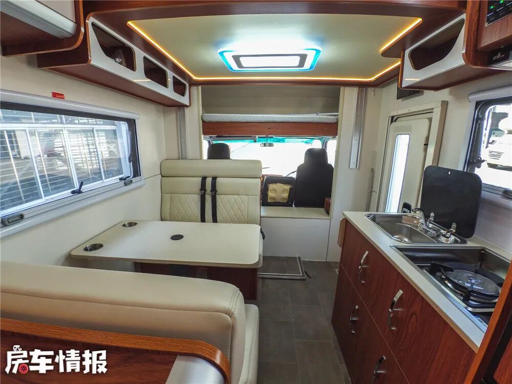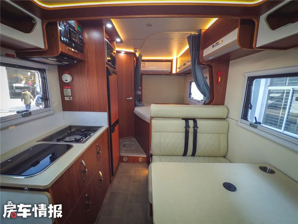 进入车厢内部,比起同尺寸无拓展的依维柯C型房车来说,卡车类房车在空间上的优势得以展现,虽然没有夸张的大,但在纵向空间方面还是很让人感到惊喜的。