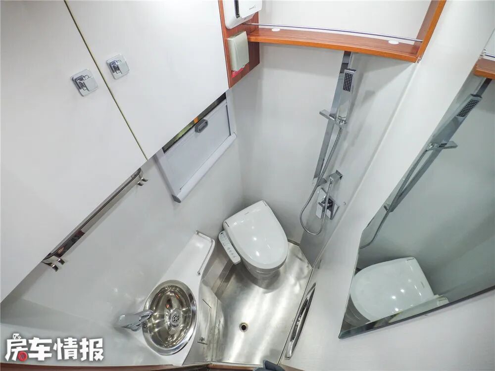 卫生间位于车厢尾部,内部空间很大,也提供了丰富的设备,马桶、洗手池、梳妆镜等,值得注意的是卫生间换气系统采用的是侧换气的形式,在马桶上还加入了一个智能座便器。