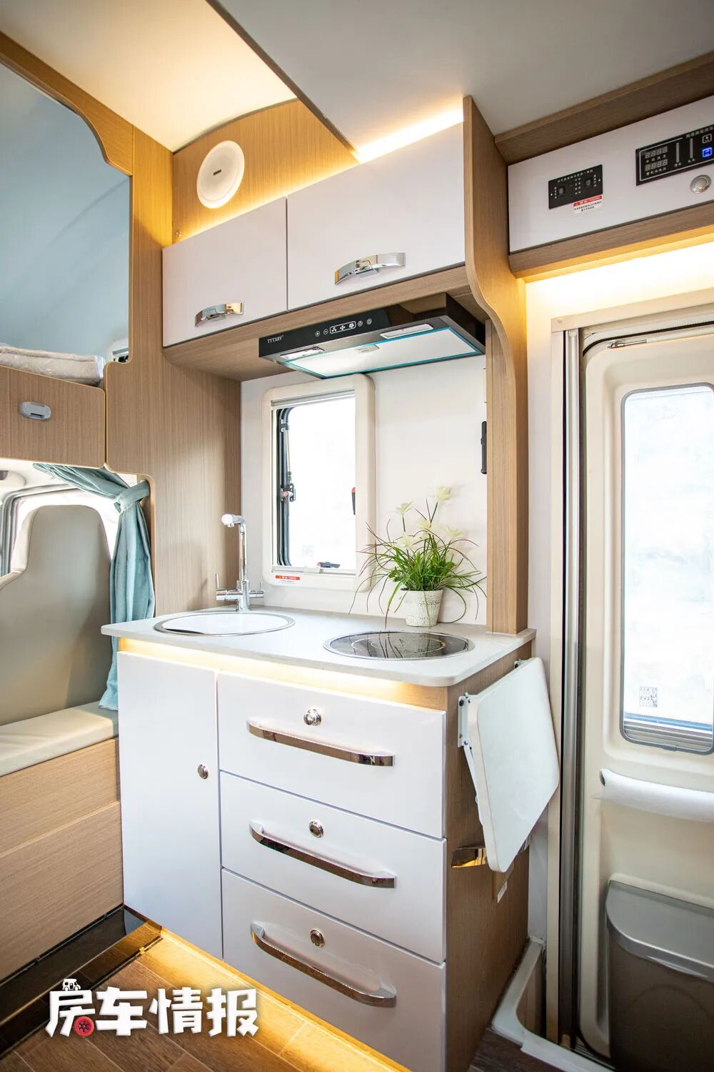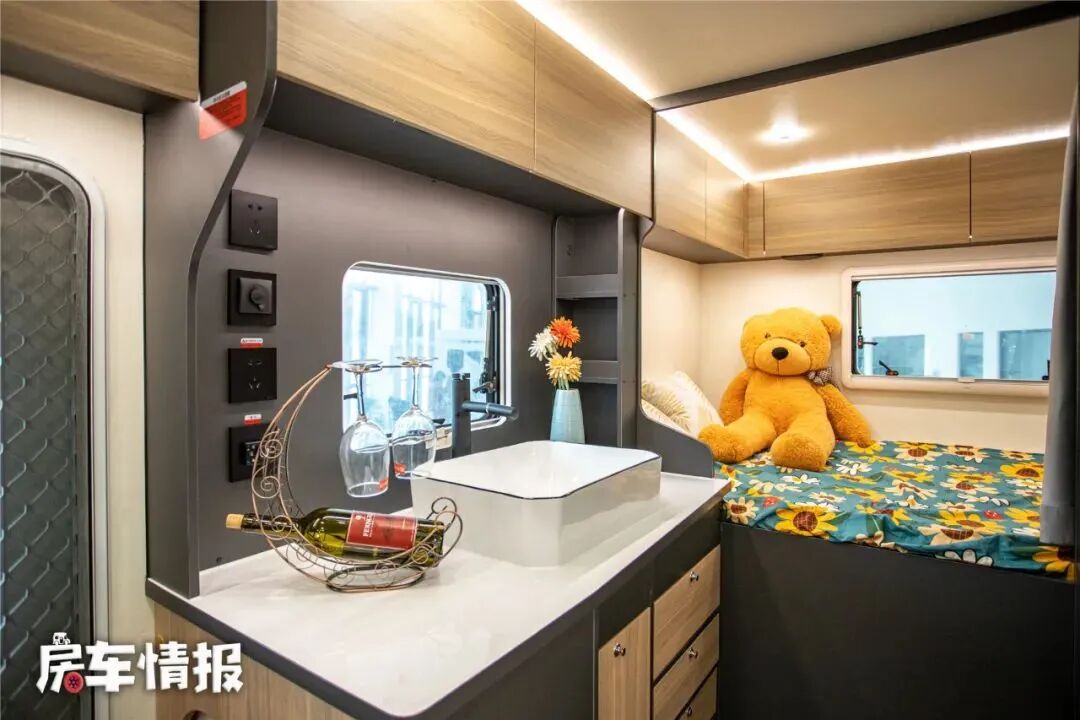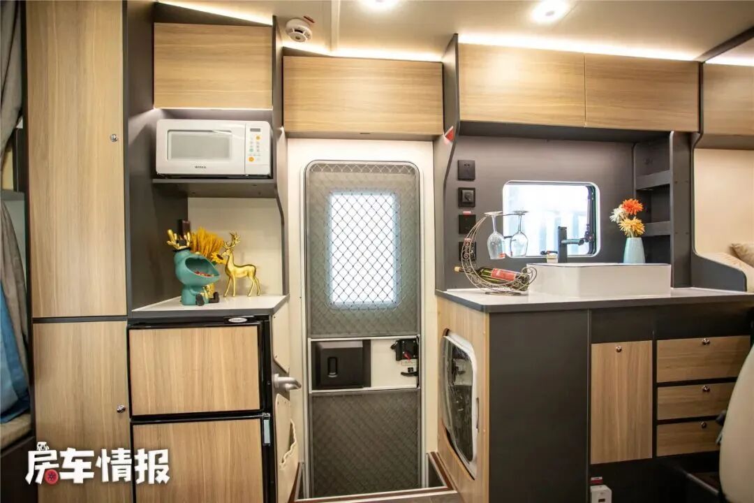 乘客门后方是厨房操作台,不过由于带有外置的抽拉灶台,所以内部的台面上只提供了一个基础的陶瓷凸起式水槽,侧面则匹配了一个小型的洗衣机,墙壁上也提供了多个充电插口,如果天气不好,想在车内进行烹饪,也可以接上电磁炉使用。