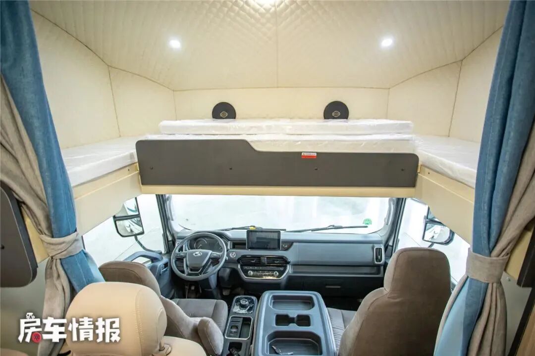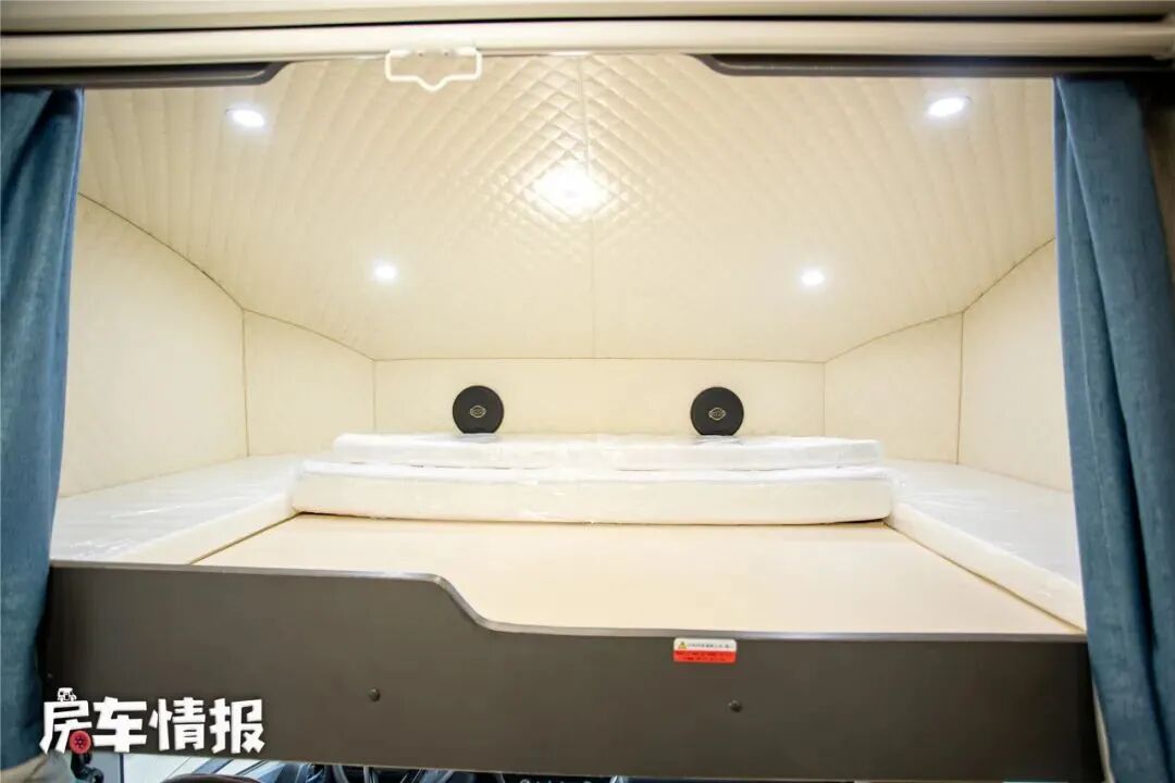 全车的固定休息区分为一前一后两个区域,最前方是位于驾驶室上方的额头休息区,内部提供了一张尺寸为2000*1400mm的床铺,可以容纳两个成年人睡觉休息的需求。