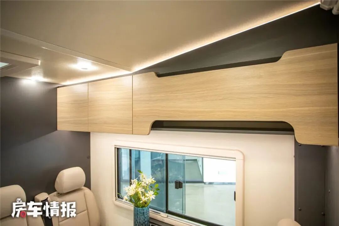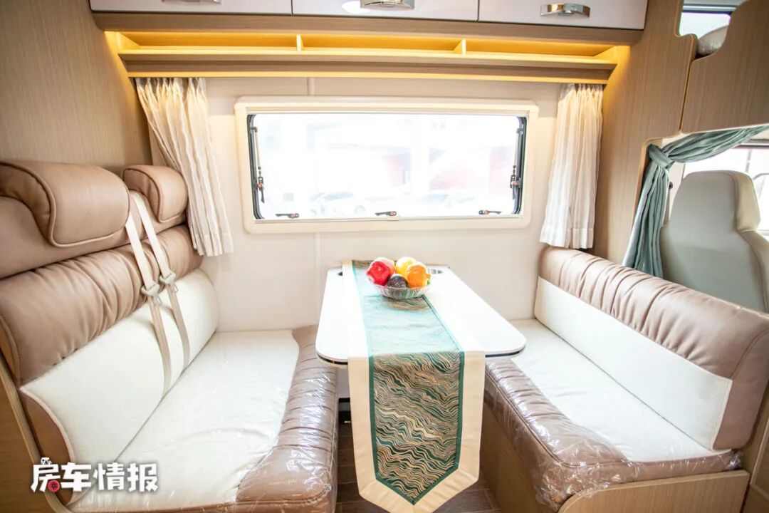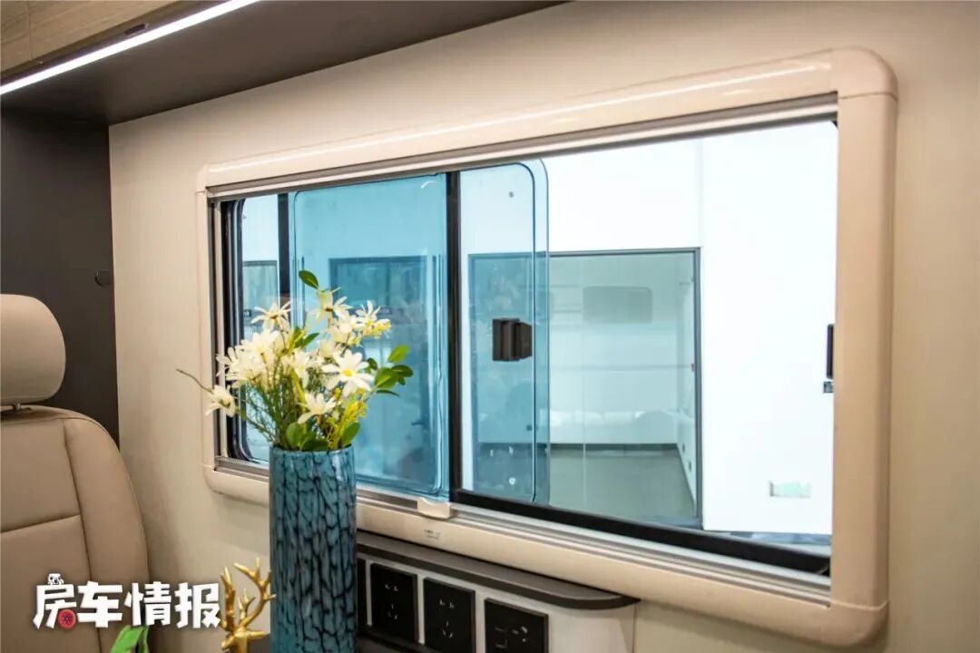 还有一个与众不同的设计就是会客区采用了推拉式的观赏窗,这样在行车时也可以打开,增加了使用的便利性和灵活度。晚上的时候也可以变成一张尺寸为1900*950的单人沙发床使用。
