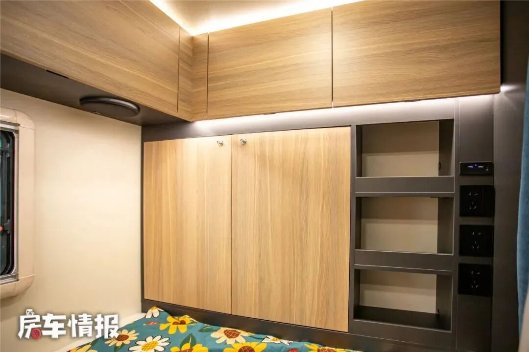 后方床铺的尺寸为2000*1350mm,日常也能满足两个人的睡眠需求,除去顶部一圈的储物吊柜,在床尾处还设计了一个壁式的储物柜,也提升了整辆车的储物能力。
