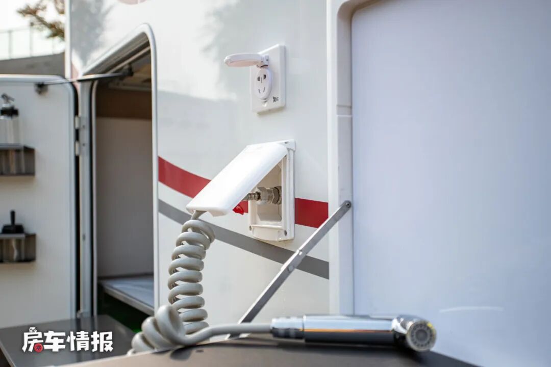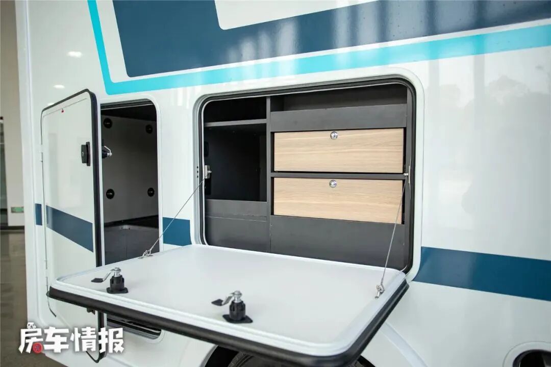 车身外部也提供了比较丰富的配件,带有外置的抽拉灶台、调料瓶架、外置翻板、外置淋浴花洒、手动遮阳棚等,这样在天气好的时候,也可以打造的一个户外的烹饪就餐区。