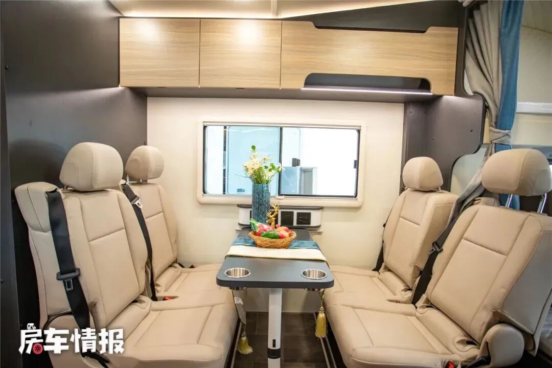 进入到车内,整体的设计感还是比较时尚的,会客区采用了四人对卡座+餐桌的设计,卡座都是乘用车级别的,可以提供更好的承托性,并且四个卡座都配有安全带,结合一主两副的驾驶座椅,所以整辆车最多核载7个人,另外在会客区顶部除去基础的储物吊柜,还带有一台隐藏式的家用变频空调。