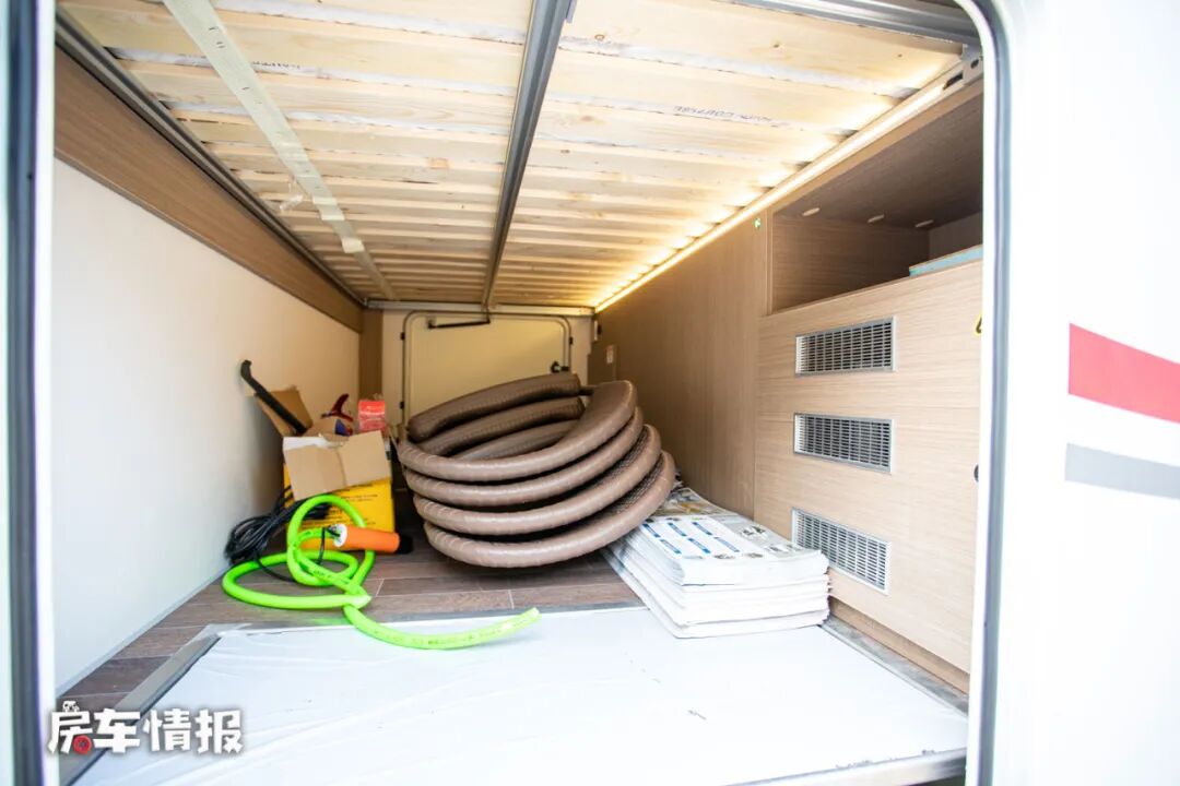 水电上,整辆车是提供了300L的净水箱、43L的灰水箱、3000W逆变器、12V 800Ah锂电池以及600W的如果新能源太阳能电池板,采用单晶硅足功率的太阳能电池板可以为房车电力提供更多的保障,同时还提供5年的质保服务,另外这款车在底盘上还带有一台12V 200A的发电机,可以做到行车一小时发电2.8度电。