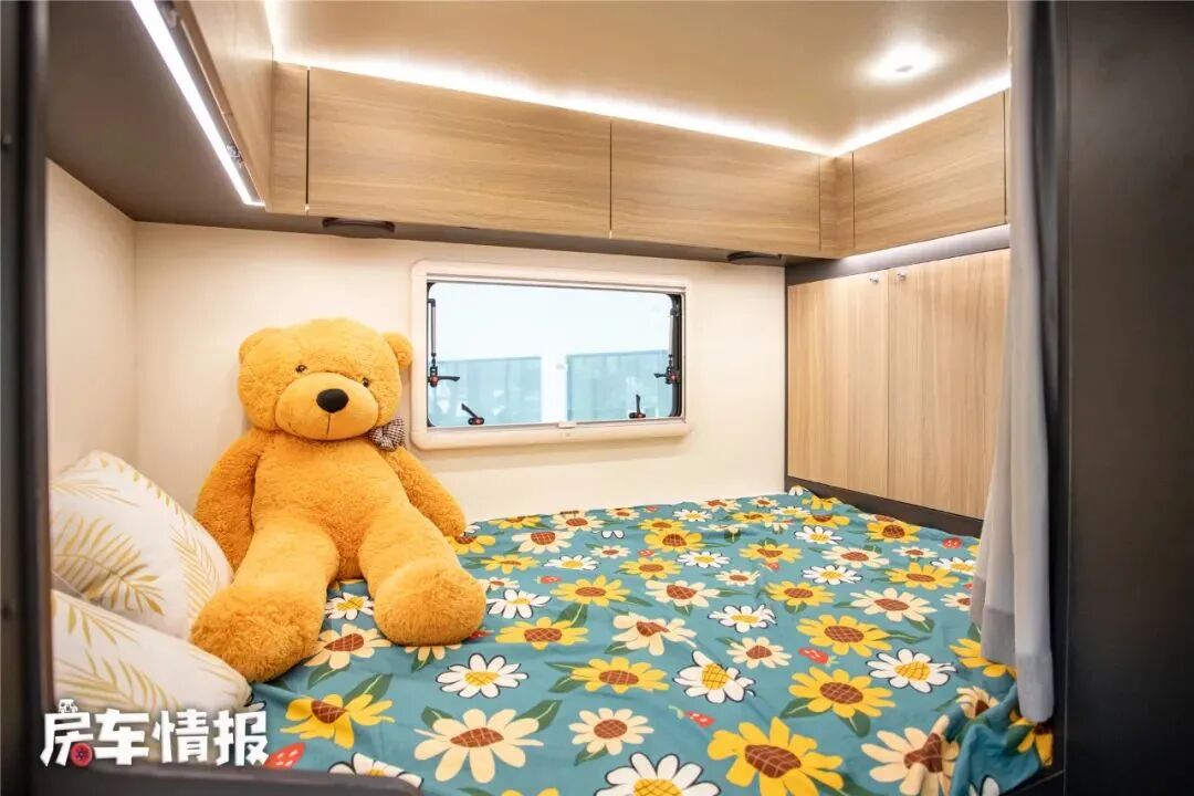 另一张床铺则位于车厢的最尾处,同样是一张2000*1400mm的横置双人床,顶部还提供了基础的吊柜和一台家用变频空调。另外在车厢后方还配置了一台小型的洗衣机,可以清洗一些轻薄的衣物。