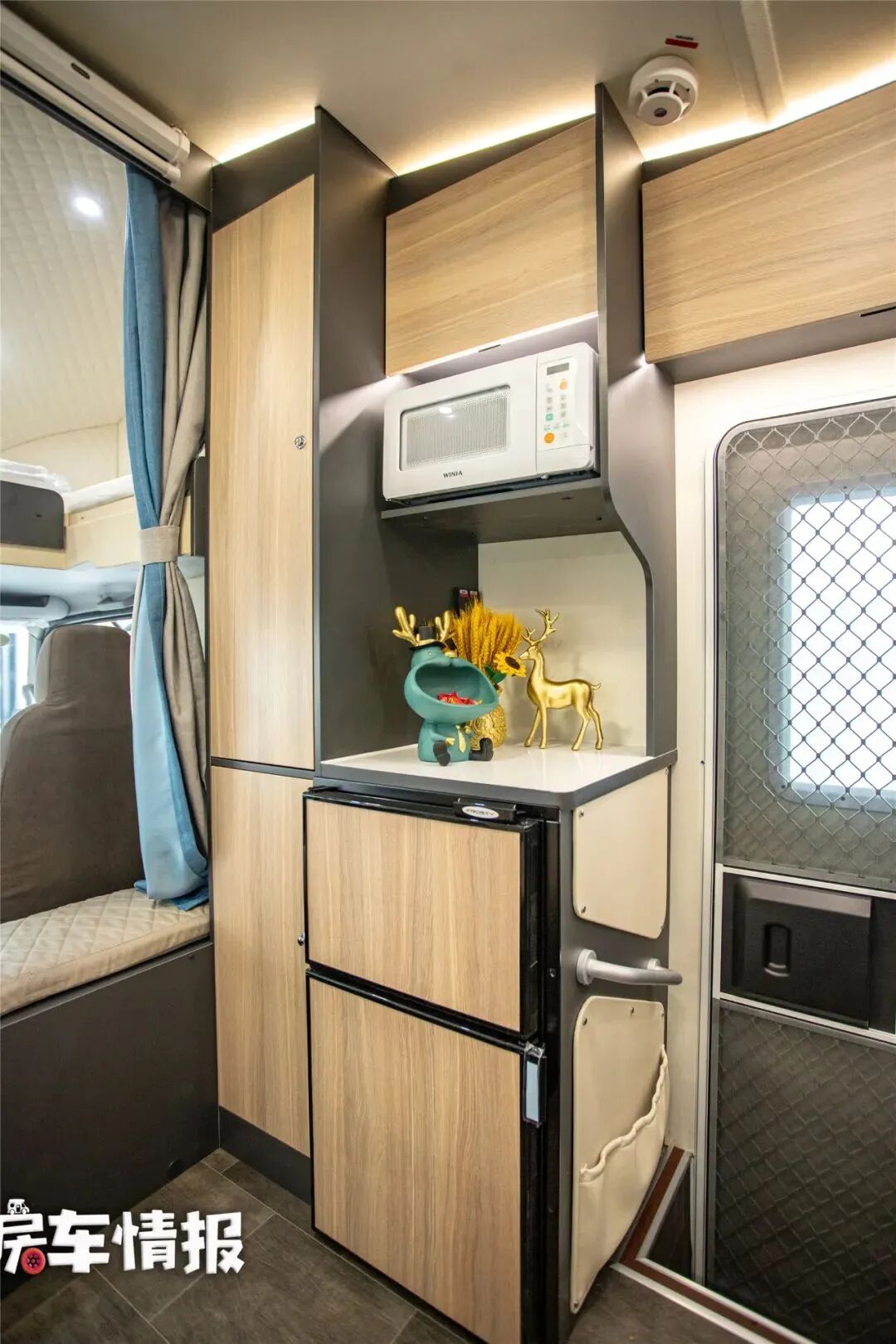 与之相对的是全车的厨房操作台,台面上带有基础的水槽、2500W的电磁炉和抽油烟机,侧面也提供了可翻折的拓展桌板,以方便日常备菜使用,而在乘客门的后面则是一台152L的上下双开门冰箱,也可以分类存放日常的食材。车内车外都带有烹饪区域,对于日常使用来说还是挺方便的。