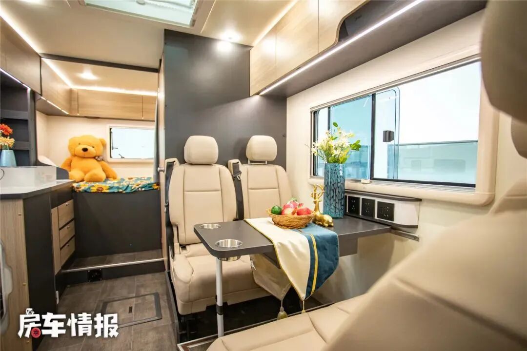 作为一款核载5个人的车型,车内的会客区采用了四人卡座沙发+升降餐桌的设计,不过因为只有后排带有安全带,所以行车的时候只能乘坐两个人,晚上则可以变成一张小型的单人沙发床以满足临时的应急睡眠需求。